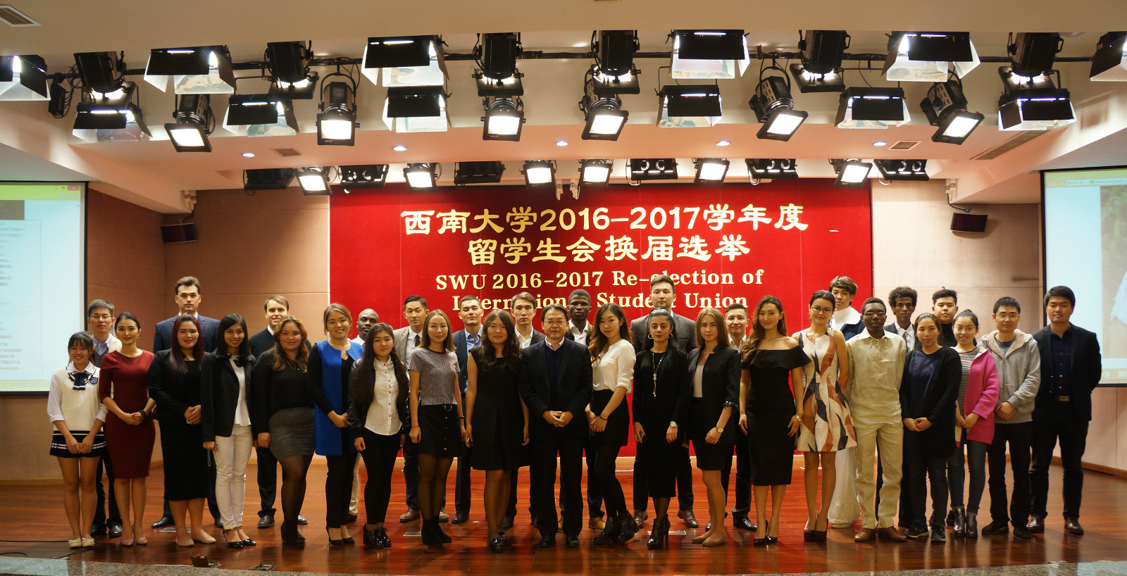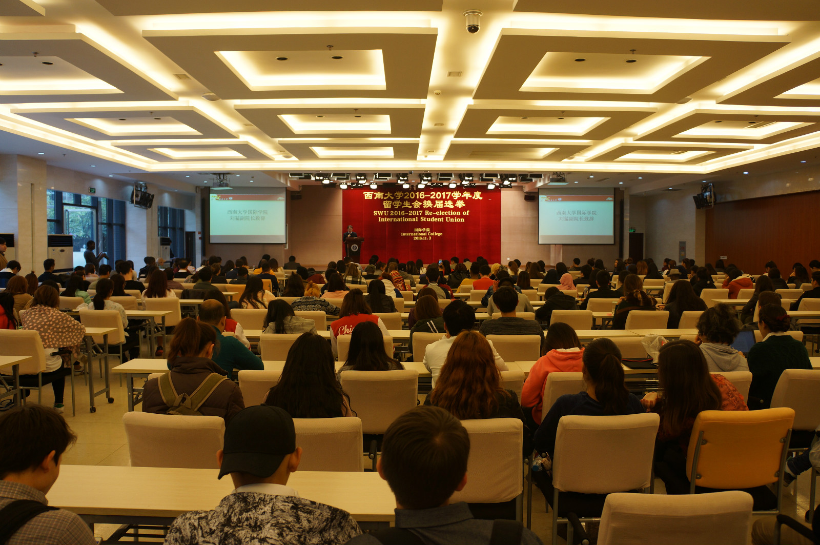 11月4日下午四点,公司2016-2017学年度职工会换届选举大会在betway必威中国报告厅举行。来自12个国家的32名候选人就新一届职工会的主席、副主席和秘书等职位展开竞选。国际公司党委书记刘猛,校员工会主席陈鹏,betway必威中国员工工作办公室老师及全校400余名职工参加选举会。