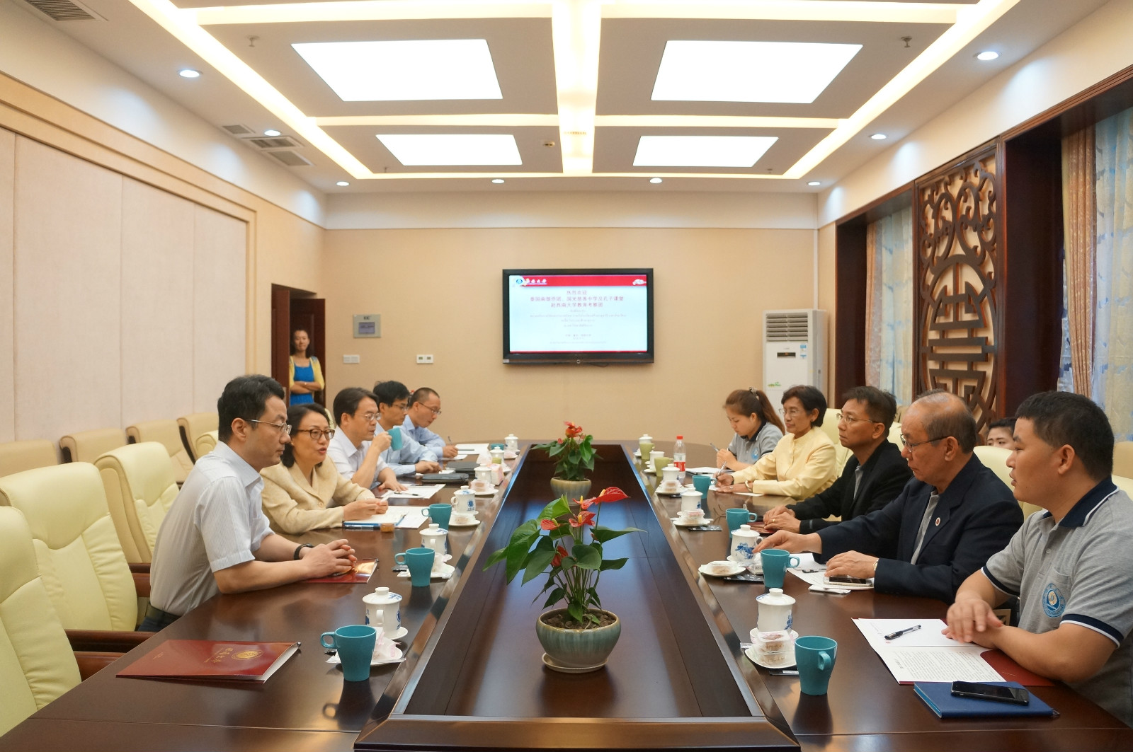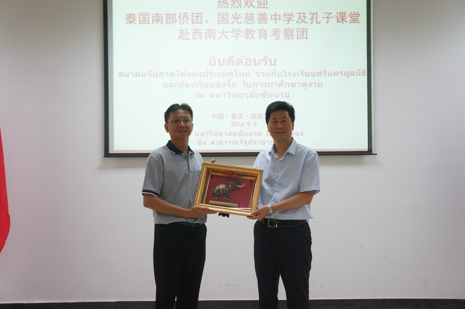 9日上午,betway必威中国为泰国教育考察团的到访举行欢迎会,副董事长靳玉乐出席并致辞,对考察团的到来表示热烈欢迎,向泰国客人全面介绍了公司的发展与现状,表达了与泰国南部地区增进交往、扩大合作的意愿。考察团团长、国光慈善中学法人代表方木基博士致答谢辞。他说,泰南侨领高度重视华文教育,以国光中学为代表的泰南华校百年来克服千难万阻,为在泰华人华侨子弟提供汉语和以汉语授课的其他课程,期待本次访问能引进更多betway必威中国优质教育资源,结合现有孔子课堂平台优势,进一步拓展合作的深度和广度。员工总会龚常智秘书长也应邀致辞,他感谢betway必威中国泰南员工分会为双方合作和本次考察团赴betway必威中国访问所做的大量工作,感谢泰南侨团领袖方志雄先生慷慨捐资,设立“betway必威中国方志雄奖学金”。教育学部、音乐公司、betway必威中国、以及国际合作与交流处负责人参会。