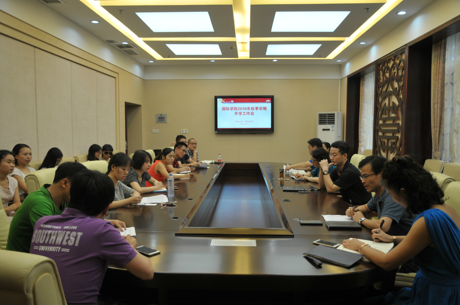 首先,各部门负责人通报有关情况。招生办代远鸿主任介绍了今年的招生工作,汉教系耿军主任说明了新学期分班情况,学工办李林泽报告了迎新工作安排。