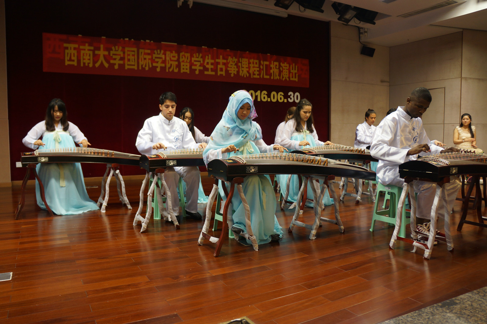 此次汇报演出分为四个小组,分别表演了《茉莉花》、《我和你》、《沧海一声笑》、《茉莉花》独唱与合奏。优美的琴声、华丽的服饰、舒缓的动作,一拨一弹,充分展示了古筝的韵味和中华文化的魅力,也赢得了在场师生热烈的掌声。特别是第四组的《茉莉花》独唱与合奏,男生优美的歌声和细腻的琴声和谐地交融在一起,赢得了在场师生无比的赞叹和久久的掌声,从而让整个汇报演出达到了高潮。