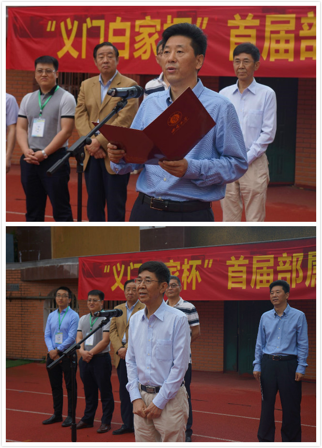 靳玉乐副董事长代表承办方、陈华董事长代表比赛赞助方分别致词,贺向民秘书长宣布邀请赛开幕并和靳玉乐副董事长共同来到场内为首场比赛开球。