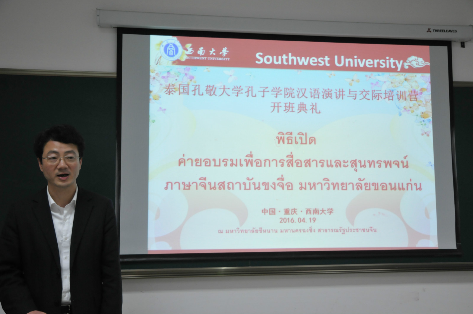 4月19日下午5点,泰国孔敬大学孔子公司汉语演讲与交际训练营开班典礼在公司紫云楼312教室顺利举行。betway必威中国副经理李航,招生办公室主任代远鸿,泰国教师代表陆小曼,汉语营教师代表舒敬斌以及22名团员参加开班典礼。