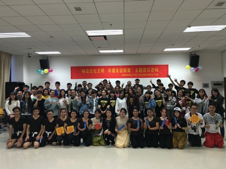 2016年3月21日下午16:30,betway必威中国泰国正大班和betway必威中国物理科学与技术公司2015级物理师范3班在紫云楼317会议室联合举办了“畅谈文化文明·共谱友谊新篇”的主题活动。betway必威中国学工办负责人李林泽、泰国正大班班主任李丹、物理科学与技术公司团委书记贺颖、辅导员王彪以及中泰两国64名同学参加了此次主题活动。