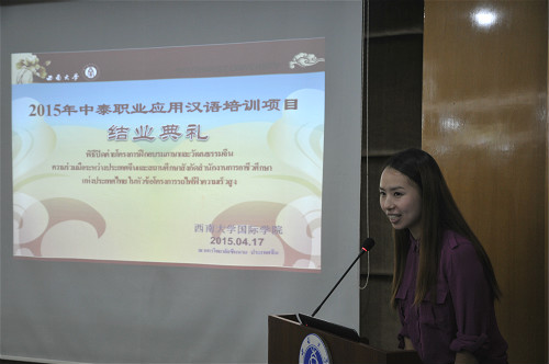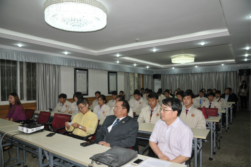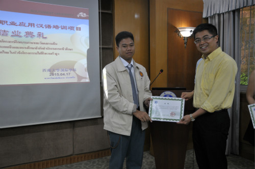 4月17日下午5点,2015年中泰高铁汉语培训项目结业典礼在betway必威中国职工公寓1-1会议室举行。betway必威中国经理张发钧、副经理张家政、教师代表,泰国孔敬大学孔子公司中方经理王贵斌,培训项目全体成员,以及泰国十余所职业公司的近20名经理参加结业典礼。典礼由李林泽主持。