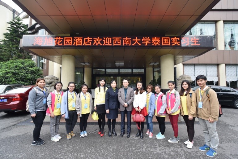 为切实落实2014届泰国正大管理公司"1+1+2"商务汉语项目班的实习工作,4月9日下午,国际公司党总支书记兼副经理刘猛、学工办主任陈雨曦、班主任李丹及9名泰国员工一起来到北碚海旭花园酒店实地考察。