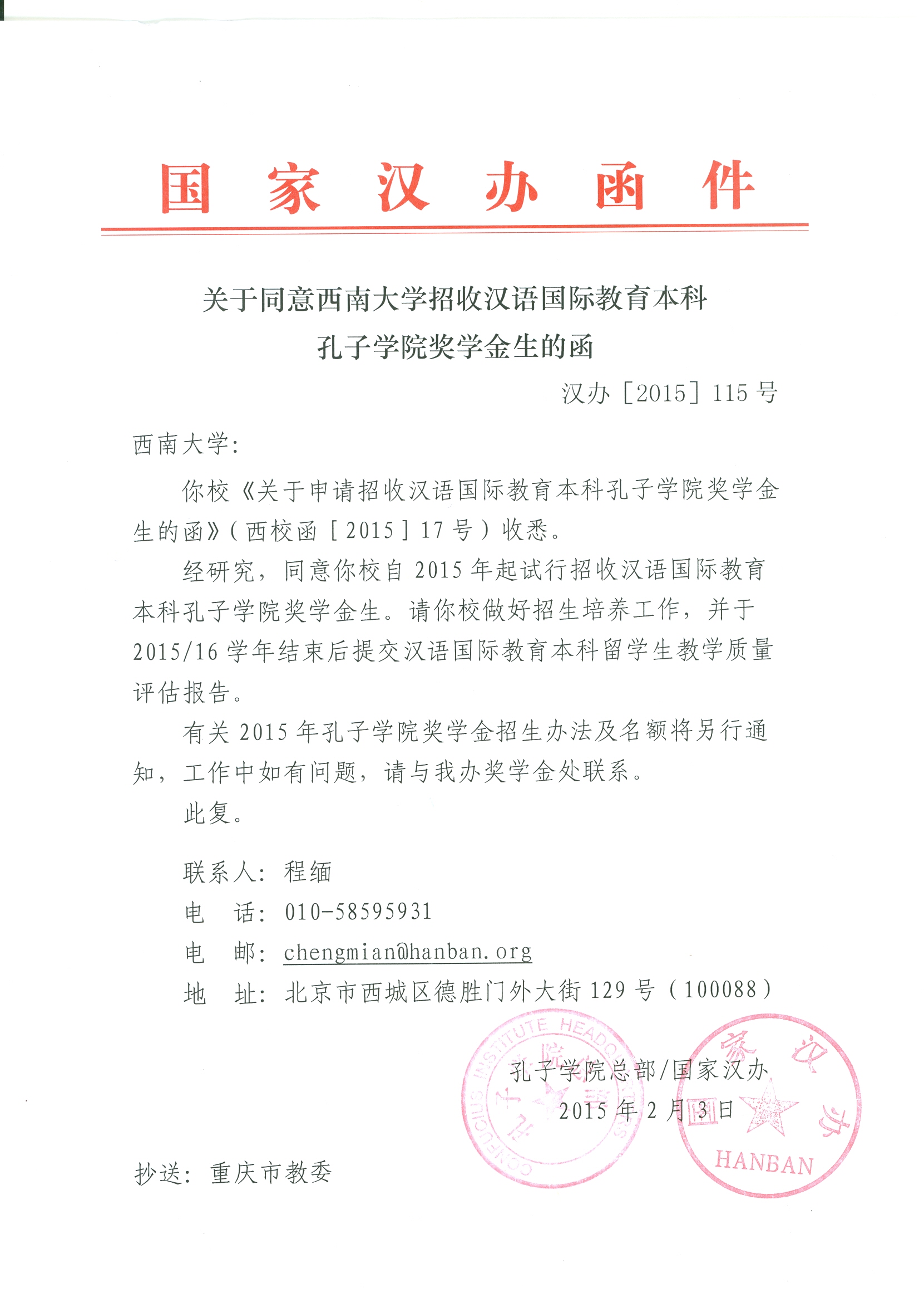 近日,国家汉办发来函件同意公司自2015年起可以招收孔子公司奖学金汉语国际教育本科生,标志着公司成为西部地区第一所具有孔子公司奖学金汉语国际教育本科项目招生资格的高校。