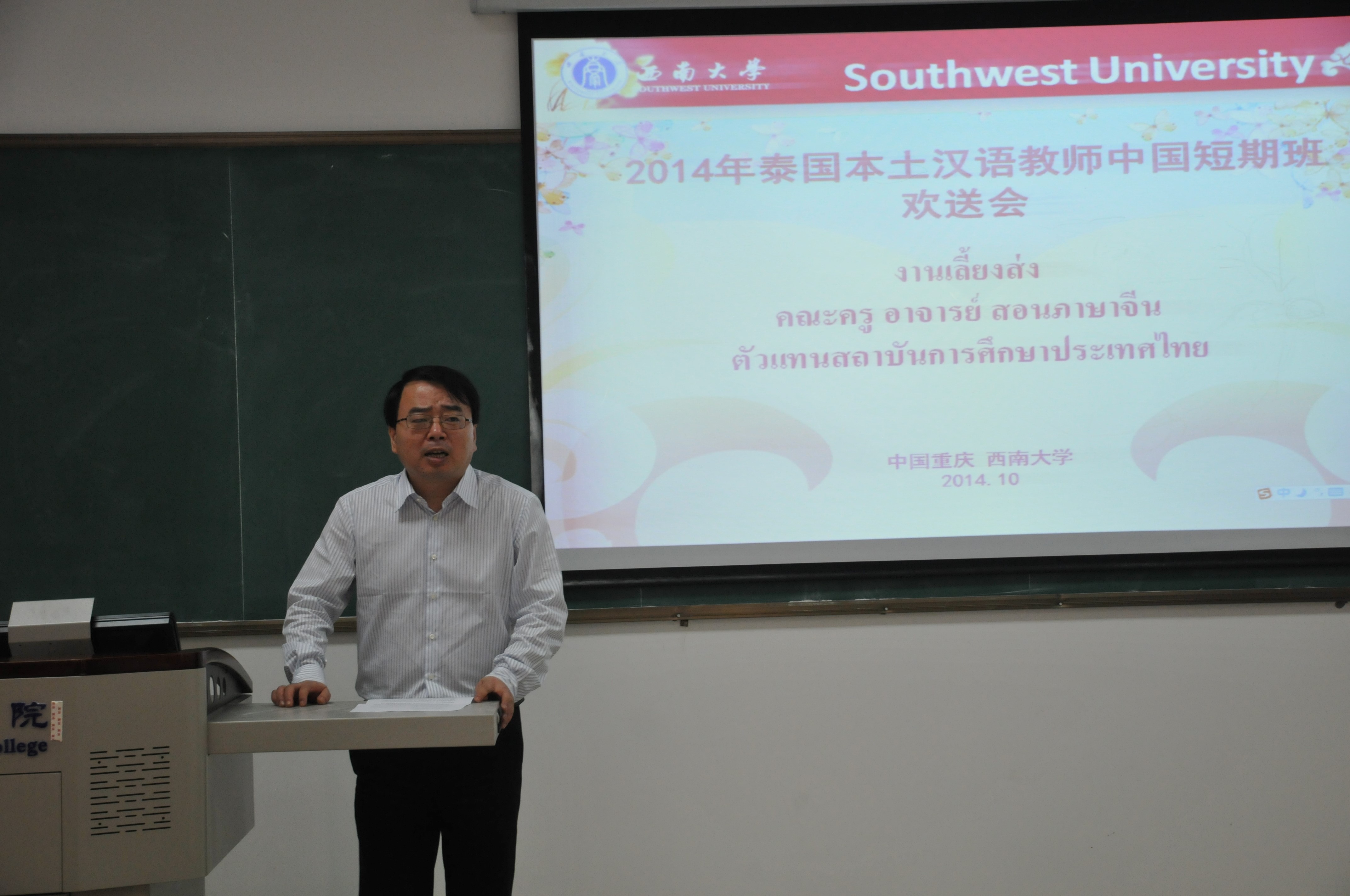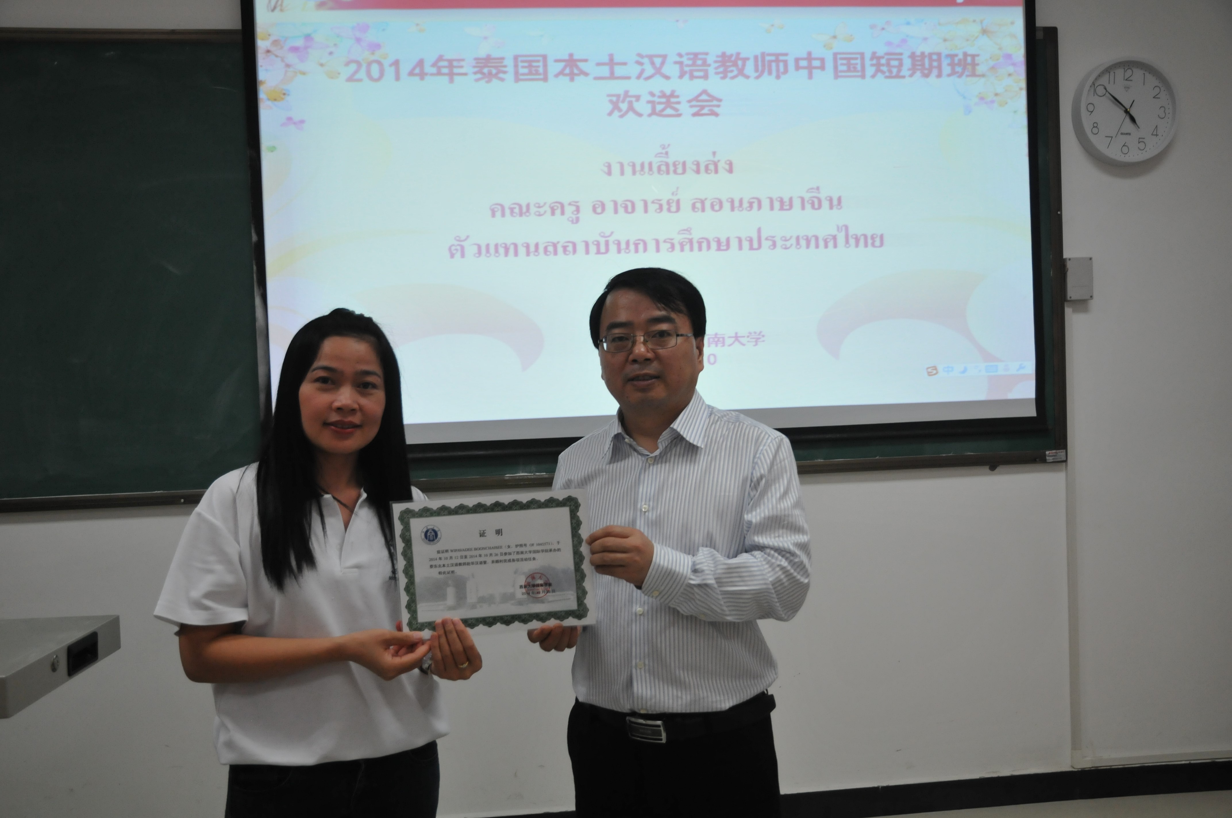 10月25日下午四点半,2014年泰东北本土汉语教师赴华汉语秋令营欢送会在betway必威中国紫云楼210室举行。betway必威中国副经理张家政以及来自泰国的20名本土汉语教师参加了此次欢送会。