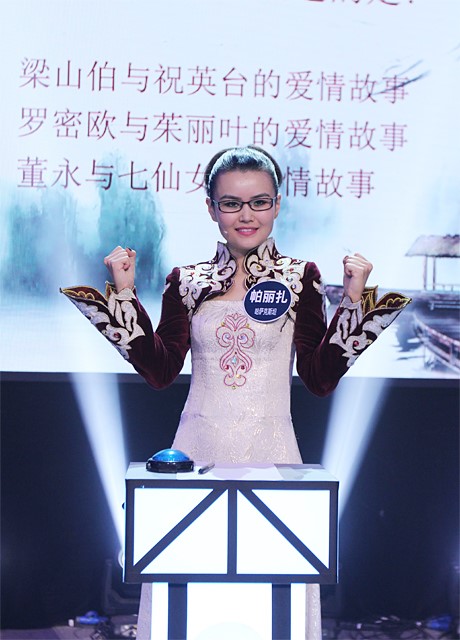 半决赛分为选手抢答、情景表演、必答题、看图猜成语、找错别字和命题演讲等环节。第一题,“刀出鞘”这一字谜一出,场上5位选手都纷纷摇头,关键时刻,帕丽扎从容给出谜底“力”字,赢得了全场掌声。帕丽扎一路过关斩将,每一环节都直接晋级,以最高分顺利进入总决赛。