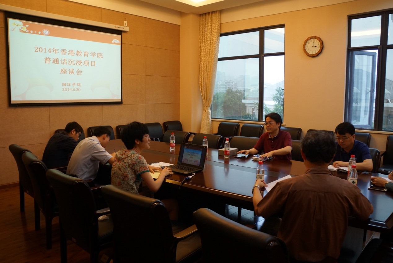 2014年6月18日香港教育公司普通话沉浸项目统筹王良和博士专程赴重庆进行项目督导。20日下午3:00在紫云楼310会议室,betway必威中国刘猛副经理、张家政副经理及项目相关负责老师与王良和博士就项目开展情况进行座谈。