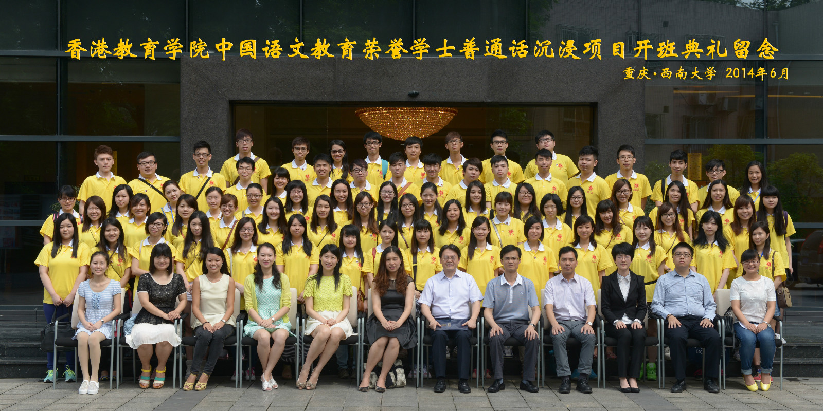 最后,本次普通话沉浸项目的全体同学与betway必威中国的领导、老师们合影留念。2014年香港教育公司中国语文教育荣誉学士普通话沉浸项目开班典礼圆满结束。