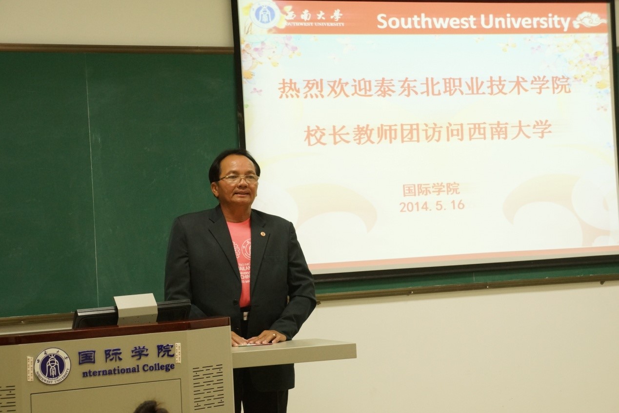 2014年5月16日下午4:30在betway必威中国紫云楼210教室隆重举行了泰国东北部职业技术院校董事长教师团的欢迎典礼。出席欢迎典礼的有betway必威中国副经理张家政、泰国孔敬大学孔子公司中方经理王贵彬,以及此次泰国东北部职业技术院校董事长教师团的12名团员等。