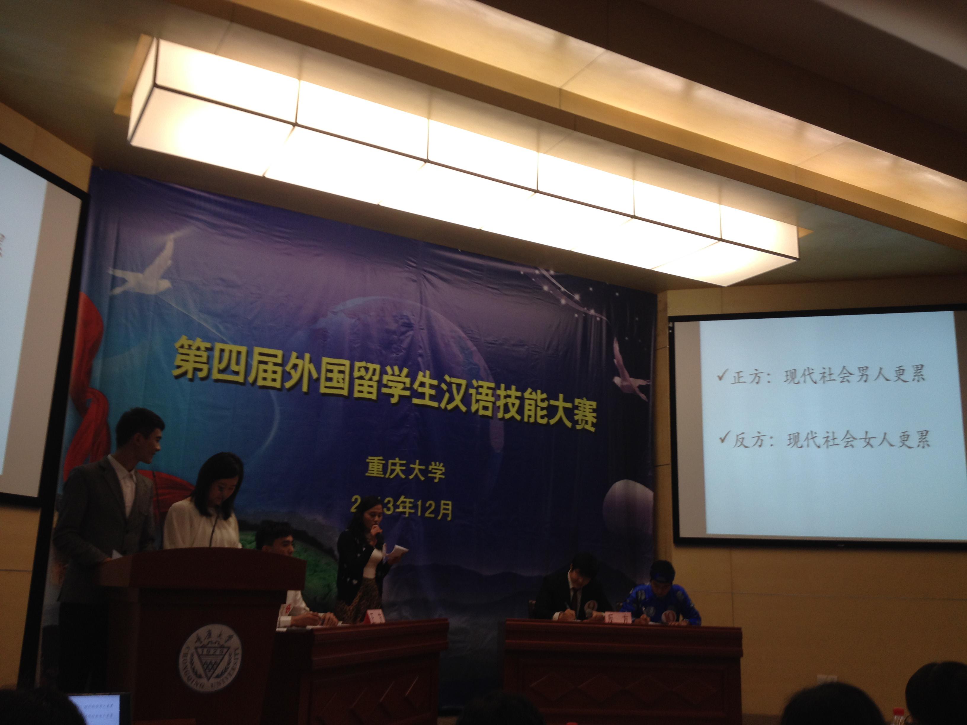 2013年12月5日下午2:30重庆大学公司举办了第四届外国职工汉语技能大赛,重庆市八所高校均派出职工积极参与此次比赛。通过紧张的预赛角逐,公司哈萨克斯坦职工帕丽扎同学以及越南职工黄英书同学进入了决赛。最后帕丽扎同学以流利的口语及丰富的中国文化知识获得评委的一致认可,摘得中级组第一名;黄英书同学在高级组辩论比赛环节中表现优异,获得第二名的好成绩。