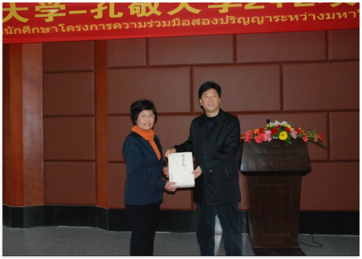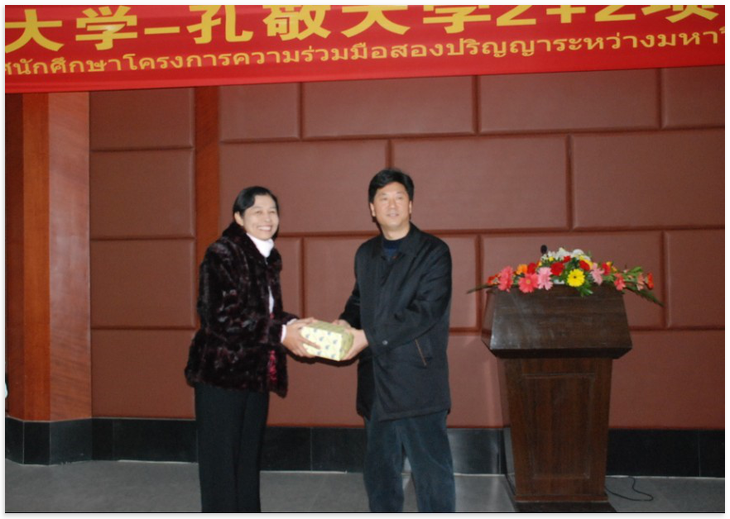 主管国际交流的betway必威中国副董事长靳玉乐教授同孔敬大学人文公司经理兼孔子公司泰方经理互赠礼物