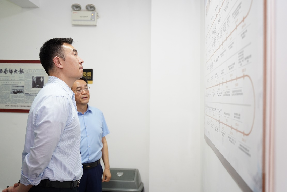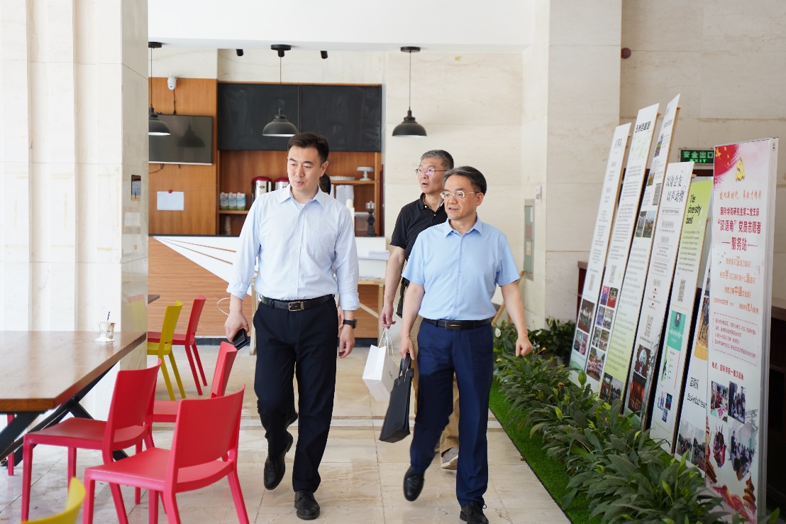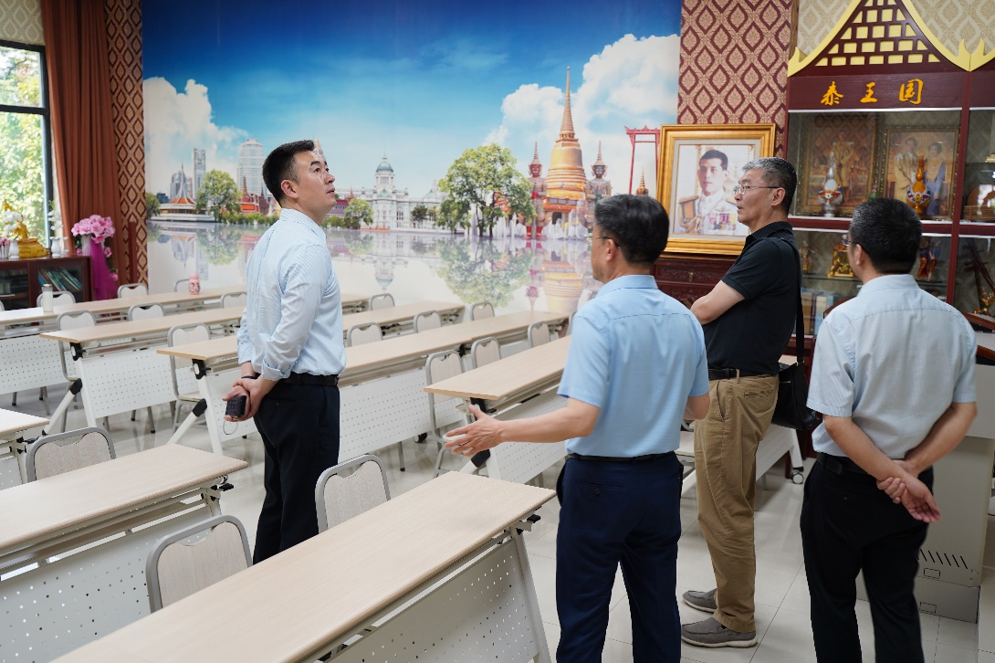 客人参观公司汉语角、泰国文化教室、中华文化体验室、汉语国际教育图书馆、国际学术报告厅,以及公司荣誉墙、照片墙、公司来华留学工作图片展。