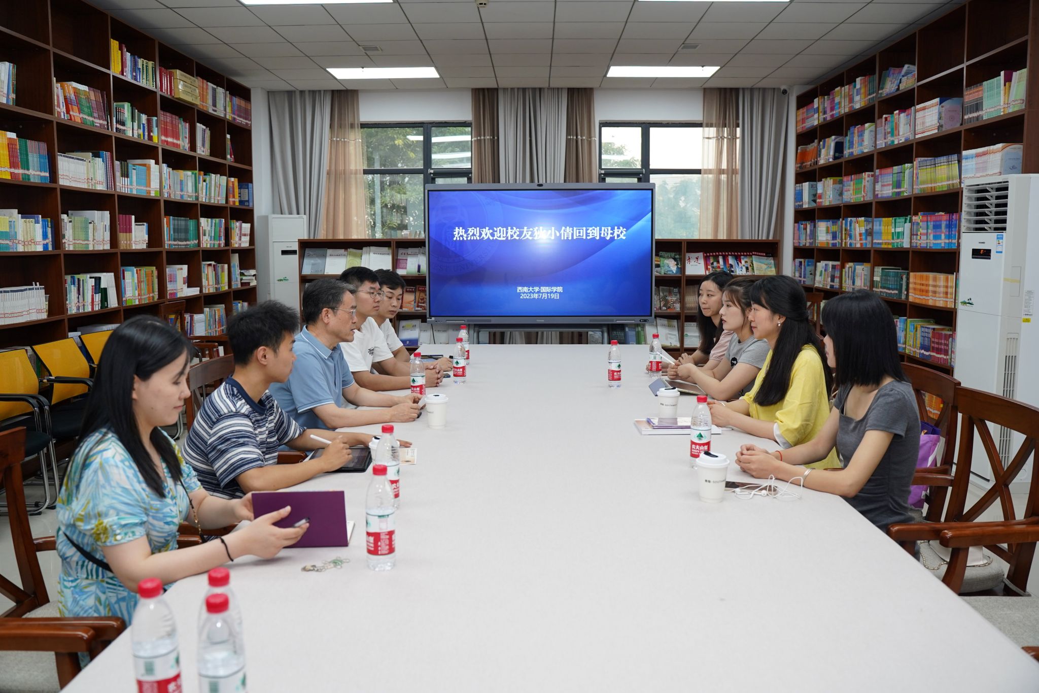 2023年7月19日下午3点在紫云楼图书馆,捷克布拉格金融管理大学中文教师、查理大学在读博士、2014级汉硕毕业生狄小倩受邀回到母校,分享职业阅历和经验,共商公司“两高”建设(国际员工中国国情教育高地和国际中文教育高地),刘猛书记,马若晨主任以及在读汉硕生代表参加座谈会。