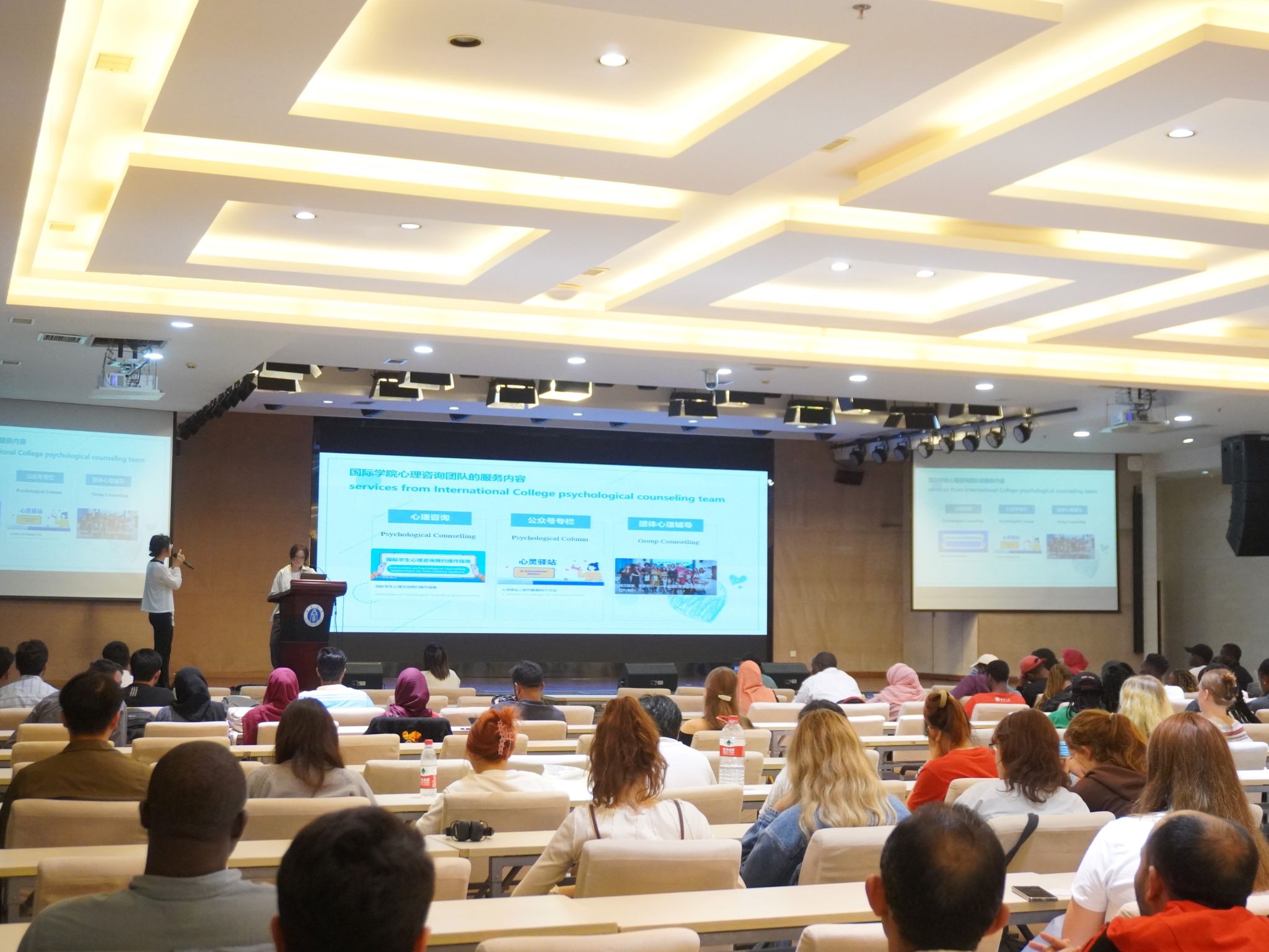 为进一步加强员工的心理健康教育,帮助国际员工更快地适应在中国的学习和生活,缓解跨文化心理压力、减轻心理负担,2023年9月27日晚7点,betway必威中国中外新生心理适应性讲座在紫云楼一楼报告厅顺利开展。公司全体国际员工新生及betway必威中国汉语国际教育汉硕生(中国)新生参与讲座,讲座由公司国际员工心灵驿站实习指导老师——王一伊、余思瑶、崔雪涵共同讲授。