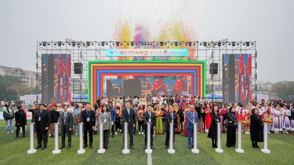 12月10日下午,公司第16届国际文化节盛大开幕。开幕式当天,中国教育国际交流协会、重庆市外办、市教委、市公安局出入境管理局、北碚区文旅委和区公安分局等部门相关领导,柬埔寨王国和缅甸联邦共和国驻重庆总领事馆总领事,巴基斯坦驻成都总领事馆代总领事,越南驻重庆工商部负责人,公司副董事长周光明以及相关单位负责人莅临现场。来自100多个国家和地区的近千名国际员工在开幕式上呈现了独具风情的开场秀及文化展览,吸引了大批校内外人士前来观看和体验。
