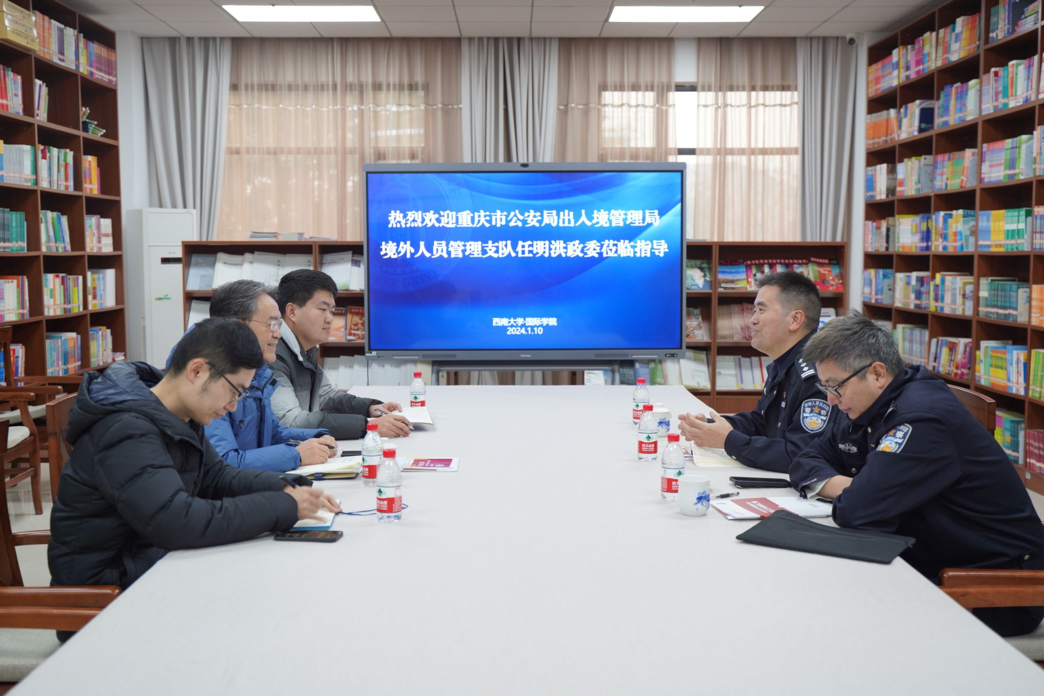 2024年1月10日上午10:00,重庆市公安局出入境管理局境外人员管理支队任明洪政委一行来公司调研,公司党委书记刘猛及学工办工作人员参加座谈会。