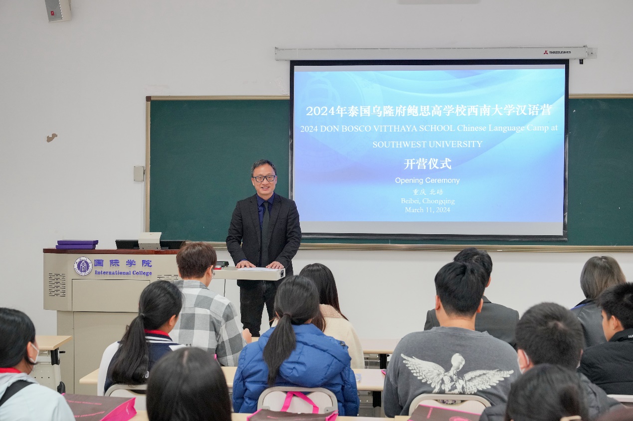 王鹊致辞欢迎来访泰国师生,简要介绍重庆和公司的基本情况,回顾公司办学历史和来华留学教育现状,重点介绍与泰国的教育交流与合作。他希望各位同学树立推动世界文明在交流互鉴中共同前进的理想,早日成为泰中友谊的使者,并真诚欢迎同学们在高中毕业后来公司留学深造。