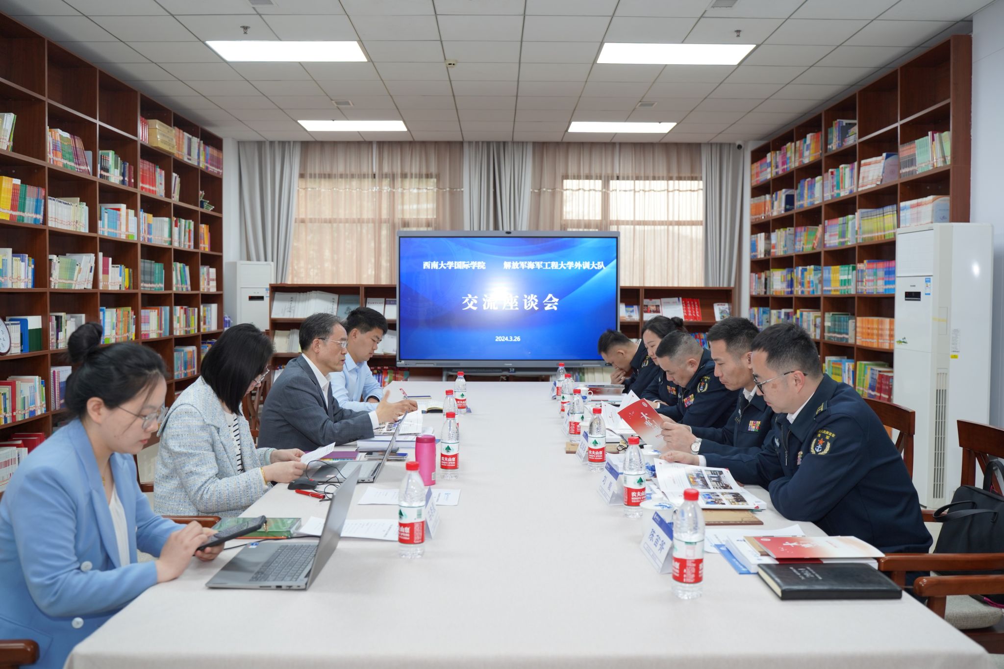 2024年3月26日上午10时,中国人民解放军海军工程大学外训大队龚攀政委一行莅临betway必威中国调研。双方在紫云楼图书馆(316室)交流座谈,betway必威中国教学办、学工办、党政办负责同志参加座谈会。