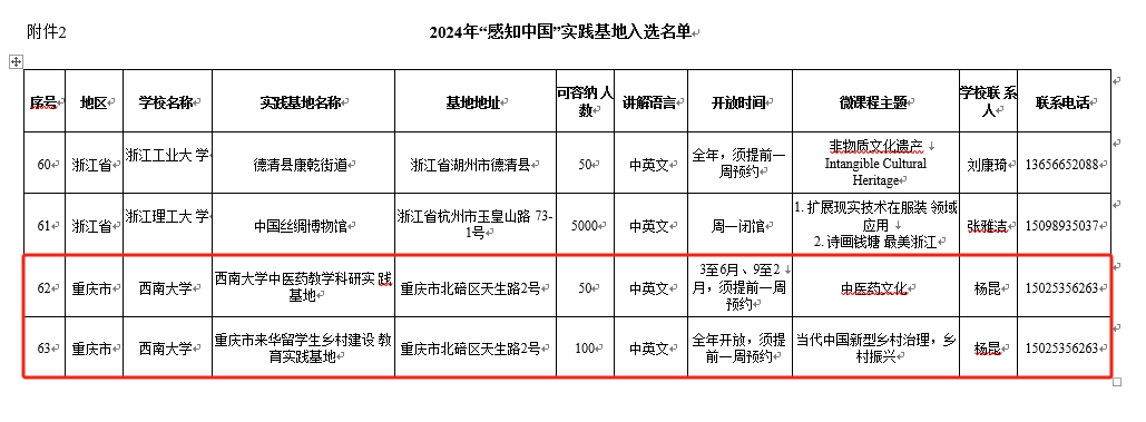 由何武教授主讲的课程“从减贫到振兴——当代中国农村的现代化之路”和杨甜副教授主讲的课程“从‘教’‘育’看中国教育的理念”成功入选国情教育微课程,“betway必威中国中医药教学科研实践基地”和“重庆市来华职工乡村建设教育实践基地”成功获批“感知中国”社会实践基地。届时,入选的微课程将在“CSC人才在线”平台展播,获批基地将接纳市内外职工开展国情教育及社会实践活动。