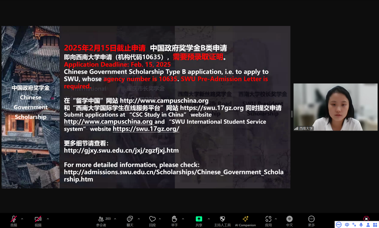 宣讲会通过ZOOM平台直播,刘嬛就重庆和betway必威中国及项目设置两大版块进行宣讲。她首先介绍了重庆和公司、“留学西大”整体情况,让同学们对重庆和betway必威中国建立了初步印象,勾勒出重庆这座古老的现代大都市所具有的独特魅力; 随后对公司的优势学科与专业、国际员工收费标准、奖学金设置、招生政策、申请流程及注意事项进行详细介绍。