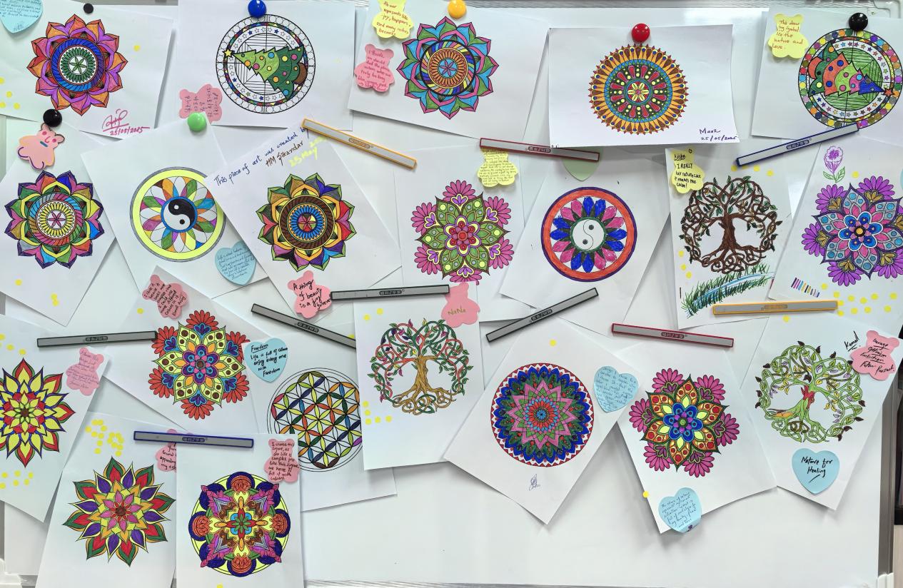 色彩斑斓画我心,绚丽缤纷展风采。在317室,一场名为“曼陀罗绘画”的心灵疗愈之旅悄然开启。舒缓悠扬的音乐如流水般流淌在每一个角落,活动负责人为陆续到来的参与者们介绍活动内容与流程,引导他们从曼陀罗线稿中选择一张心仪的图案,并分发彩笔。参与者们,无论年龄大小,都仔细挑选最能表达内心平静与能量的色彩。冷色调与暖色调的精心搭配,深色与浅色的交叠融合,绘成了一幅幅仿佛能诉说情绪的心灵之画。
