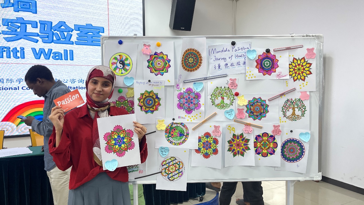 参与者们完成作品后,将画作放置在“心灵画廊”桌面展示区,并用便利贴写下创作感悟和思路,将文化元素与情绪联结,进行跨文化分享。来自莱索托的乔伊斯分享她的绘画:“我在选择颜色时优先考虑了粉色,想展现我对美丽、女性力量的热爱;但在绘画过程中我还是融入了棕色,以此来提醒自己:生活并不总是充满美好事物。因此,我也要学会与内心对话,学会深呼吸,让自己更加坚韧。”