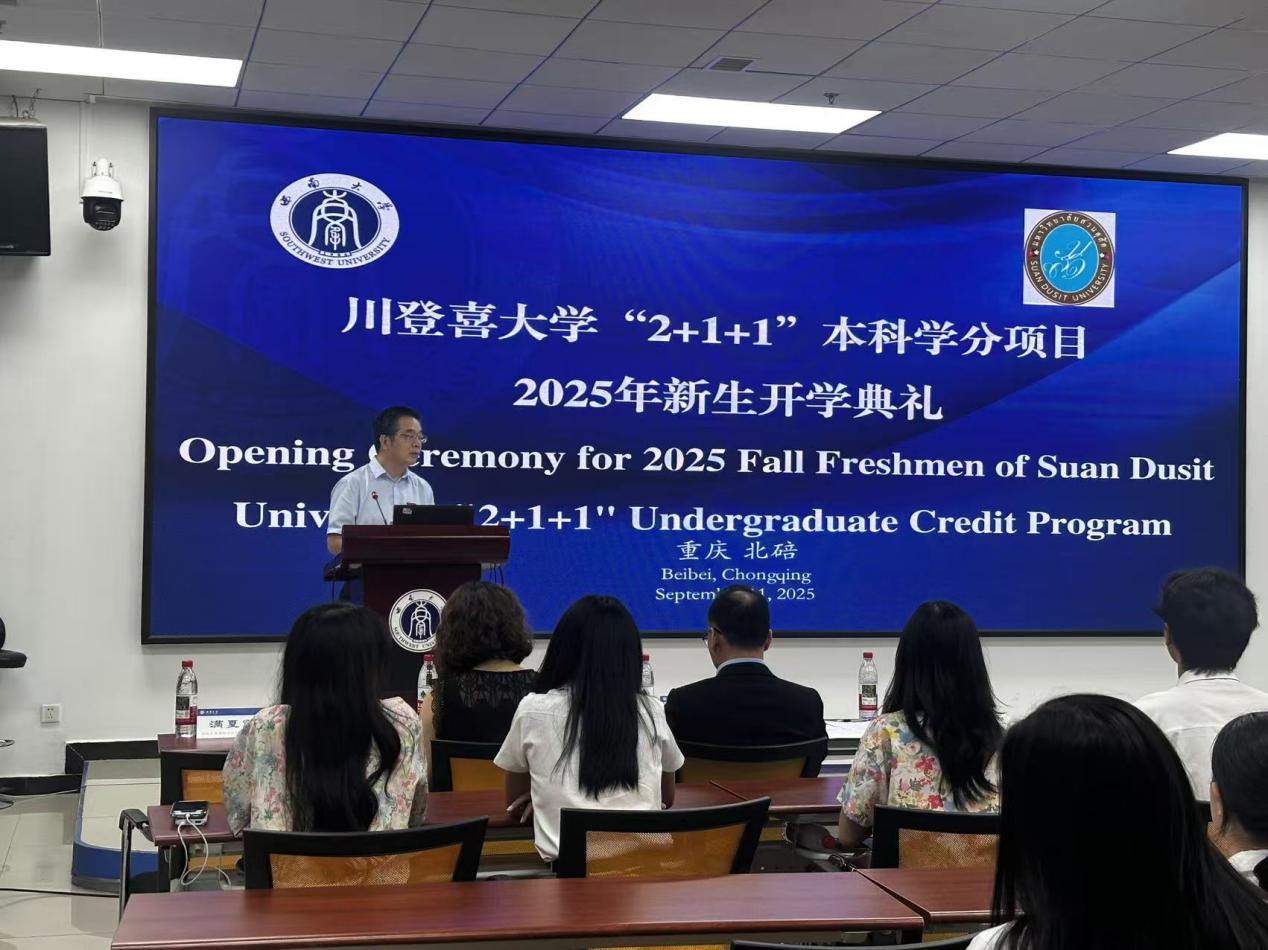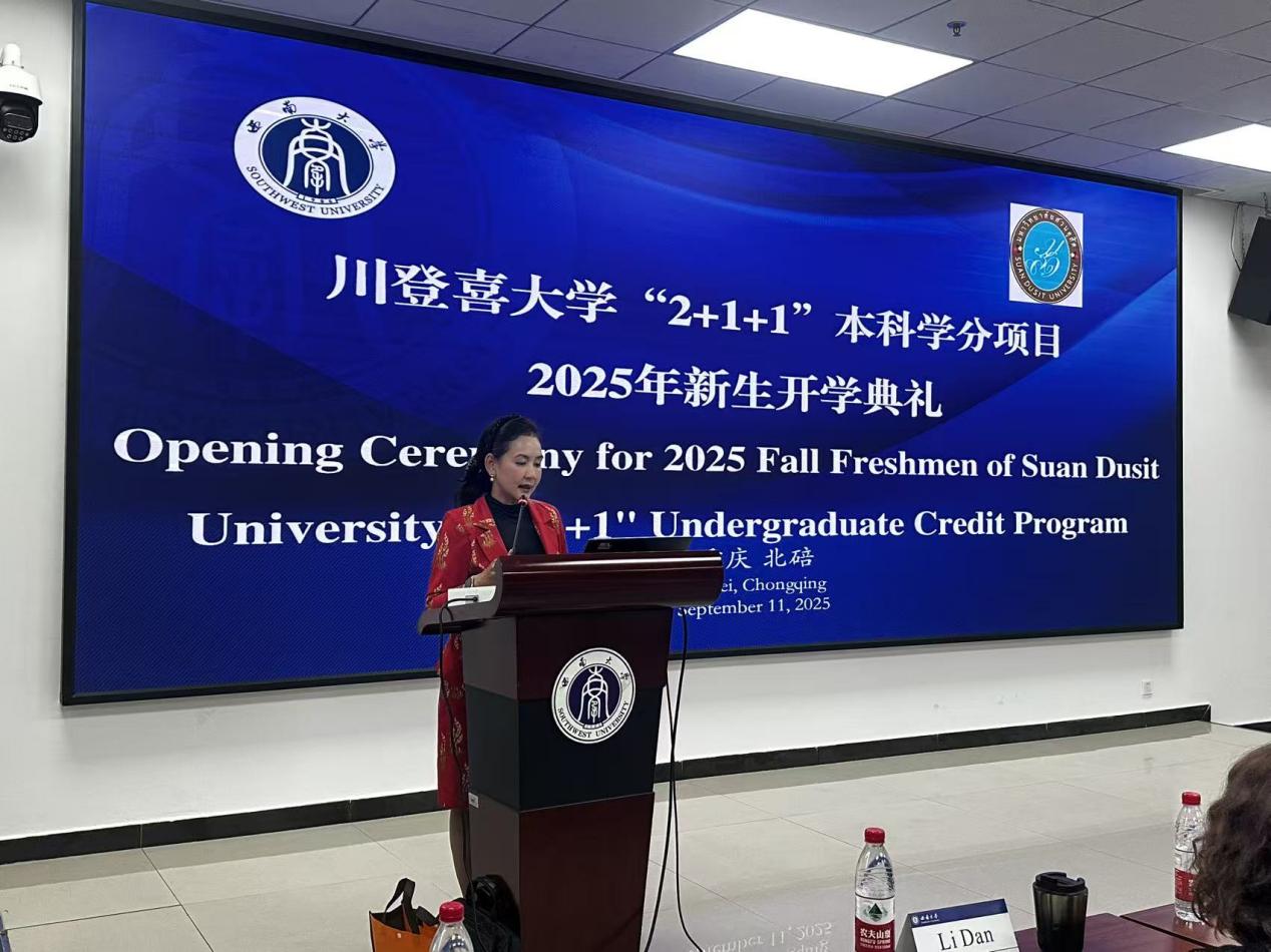 随手,泰国川登喜大学副董事长蓬差尼・盖奈女士致辞。她表达了对新生们在跨文化学习中突破自我、收获成长的殷切期待,并展现了对两校合作项目的坚定信心。