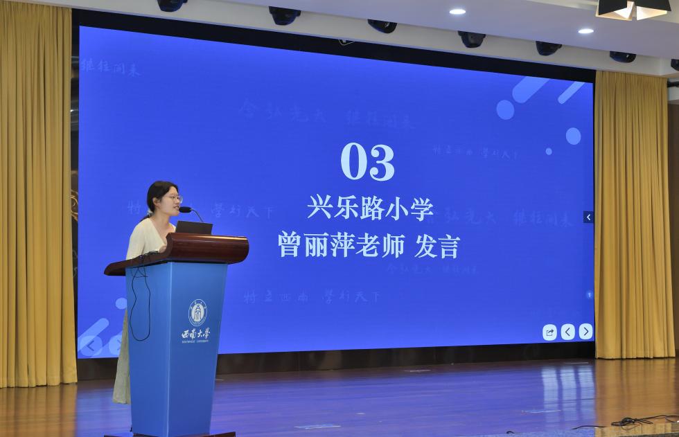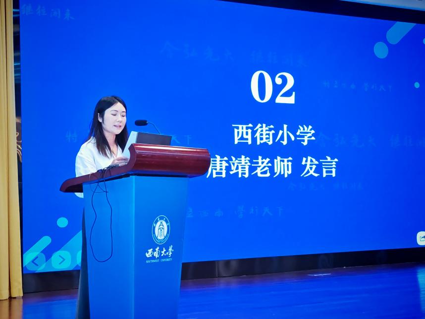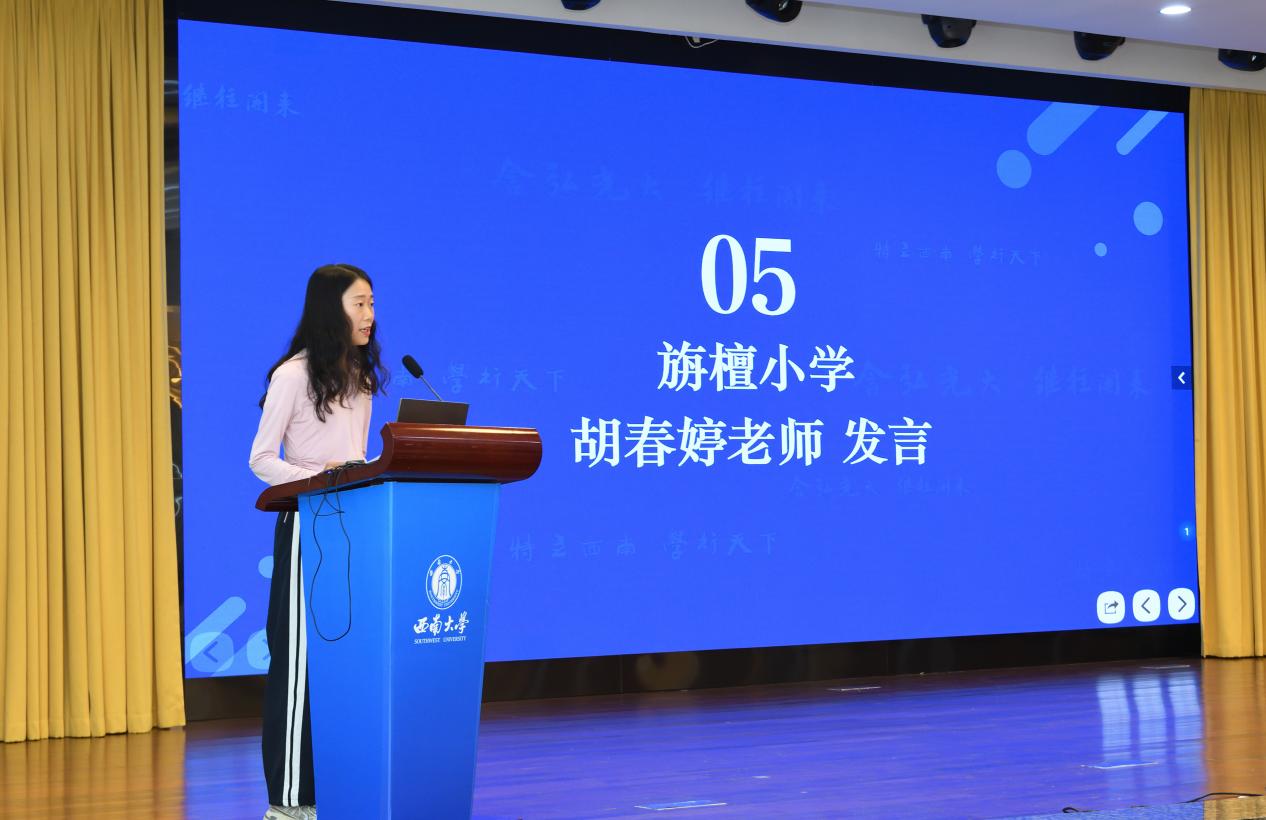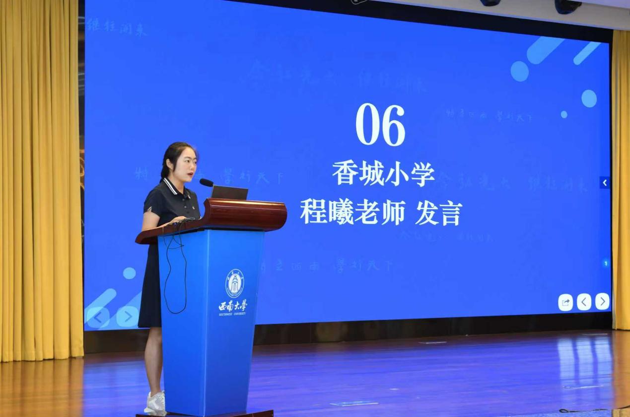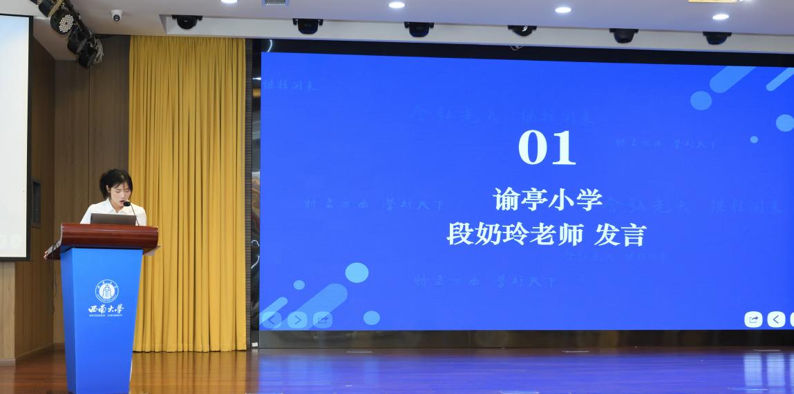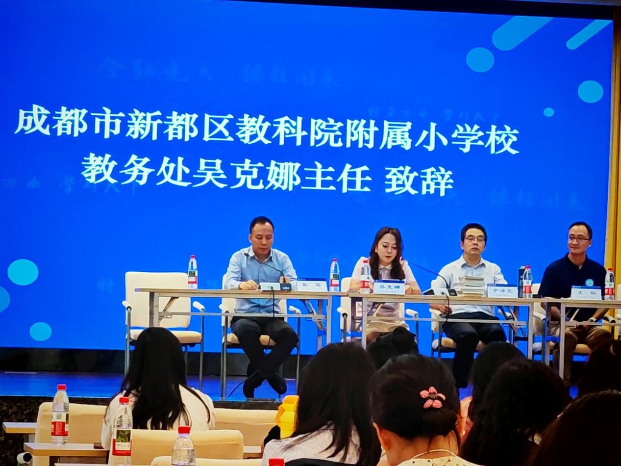 教科院附属小公司教务处吴克娜主任作为学员代表发言。她表示:"我们怀着对教育事业的赤诚之心而来,带着对专业成长的渴望之情而学。全体学员将以空杯心态投入学习,积极参与各项研修活动,力求在理论素养和实践能力上获得全面提升,将先进的教育理念和教学方法带回新都,惠及更多学子。"