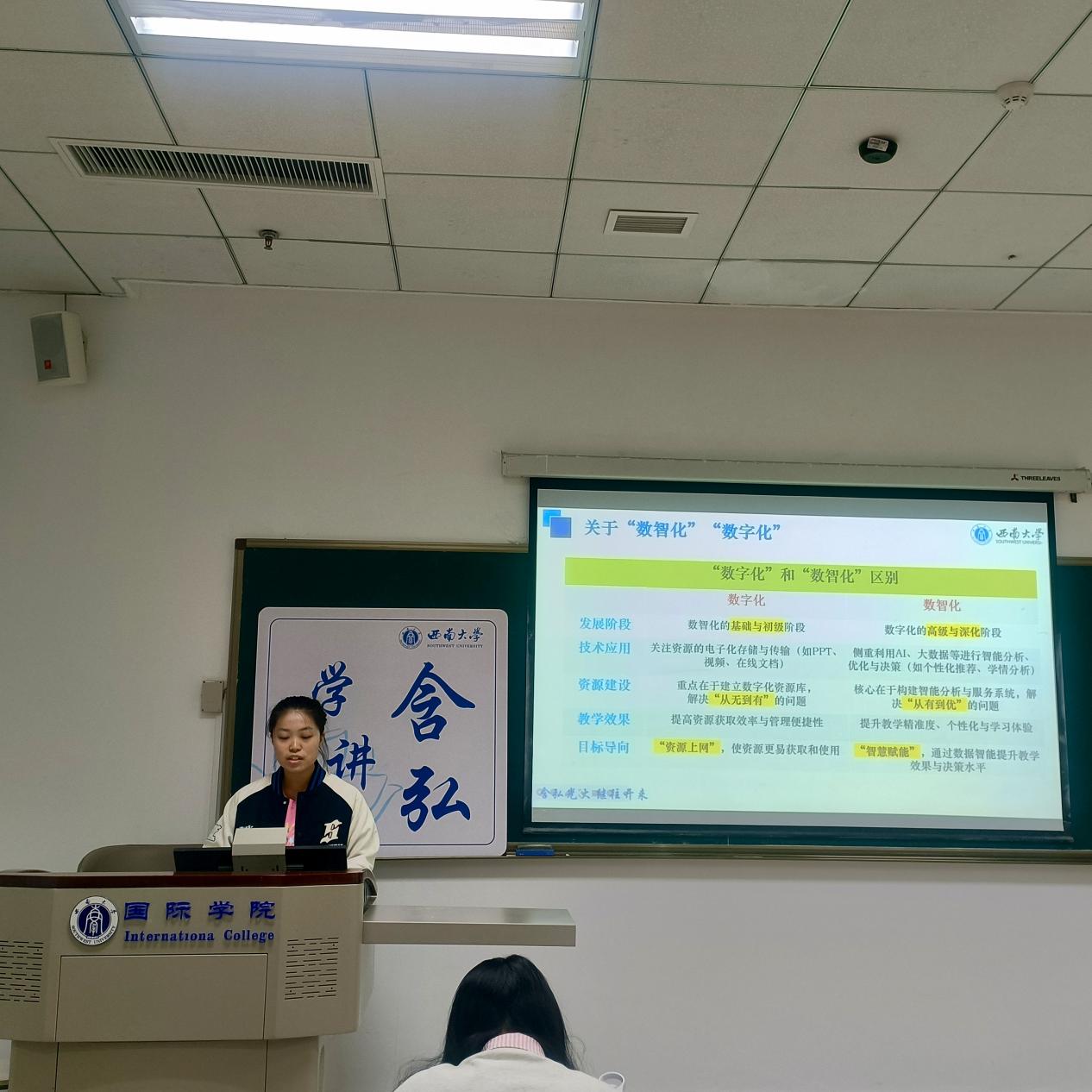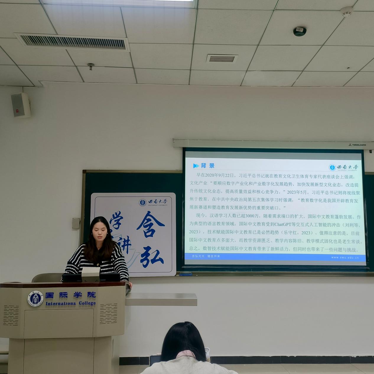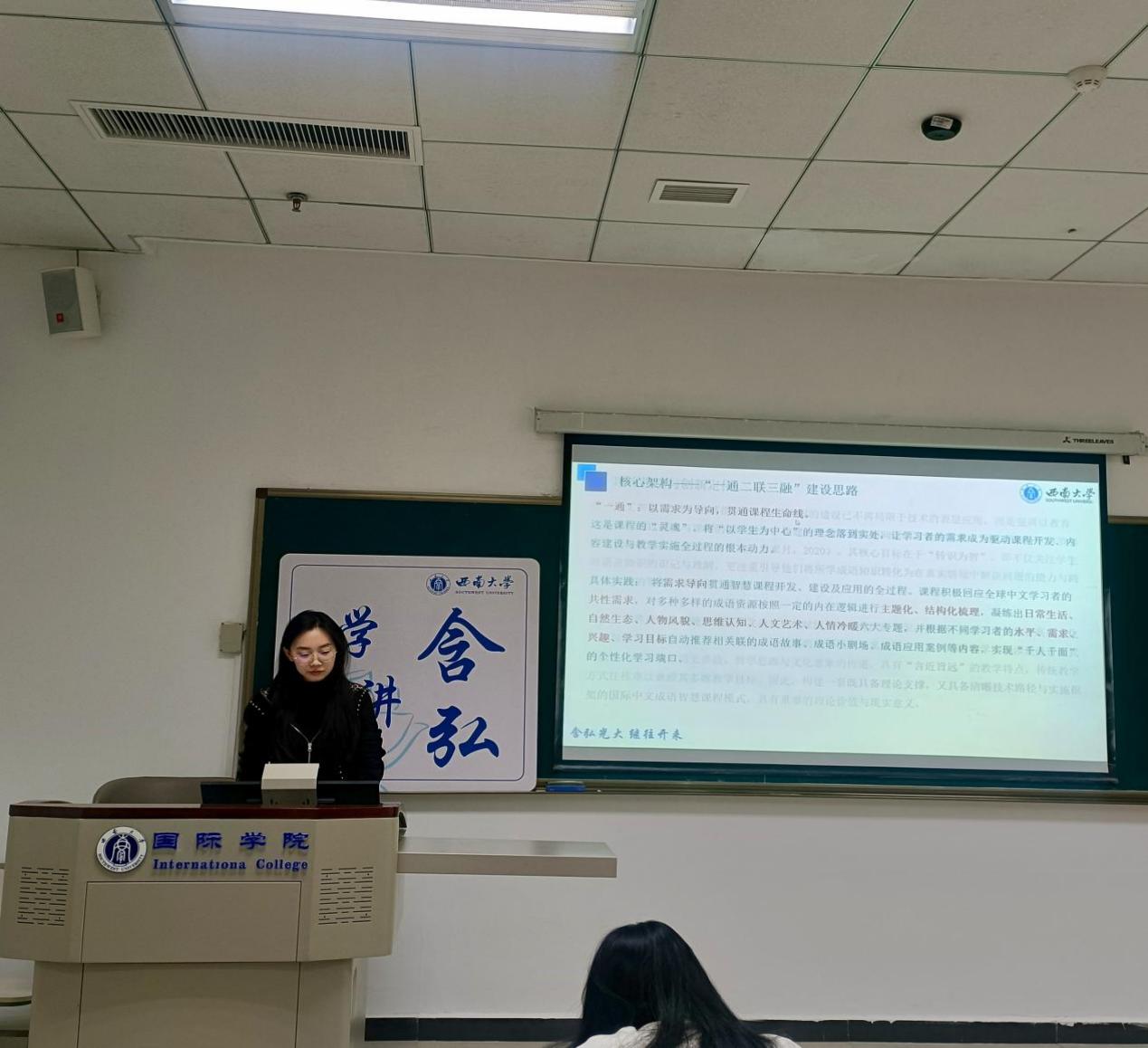 本次含弘学子讲堂宣讲内容紧扣数智时代国际中文教育的前沿议题,涵盖智慧课程、AI智能体、教学资源变革、短视频教学与写作创新等多个维度。五位主讲人不仅呈现出扎实的理论基础与敏锐的科研洞察,也通过具体案例展现了国际中文教育专业员工在教育数字化转型中的积极探索与创新活力。此次讲堂为在场学子提供了深入思考技术赋能教育的新视角,激发了员工对未来教学范式革新的广泛讨论,更为国际中文教育的高质量发展注入了实践智慧与变革动能。