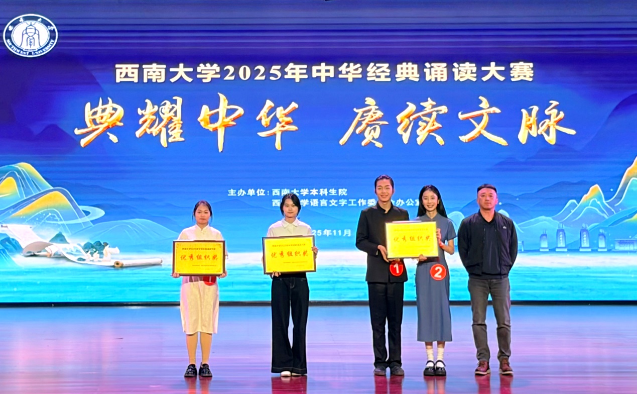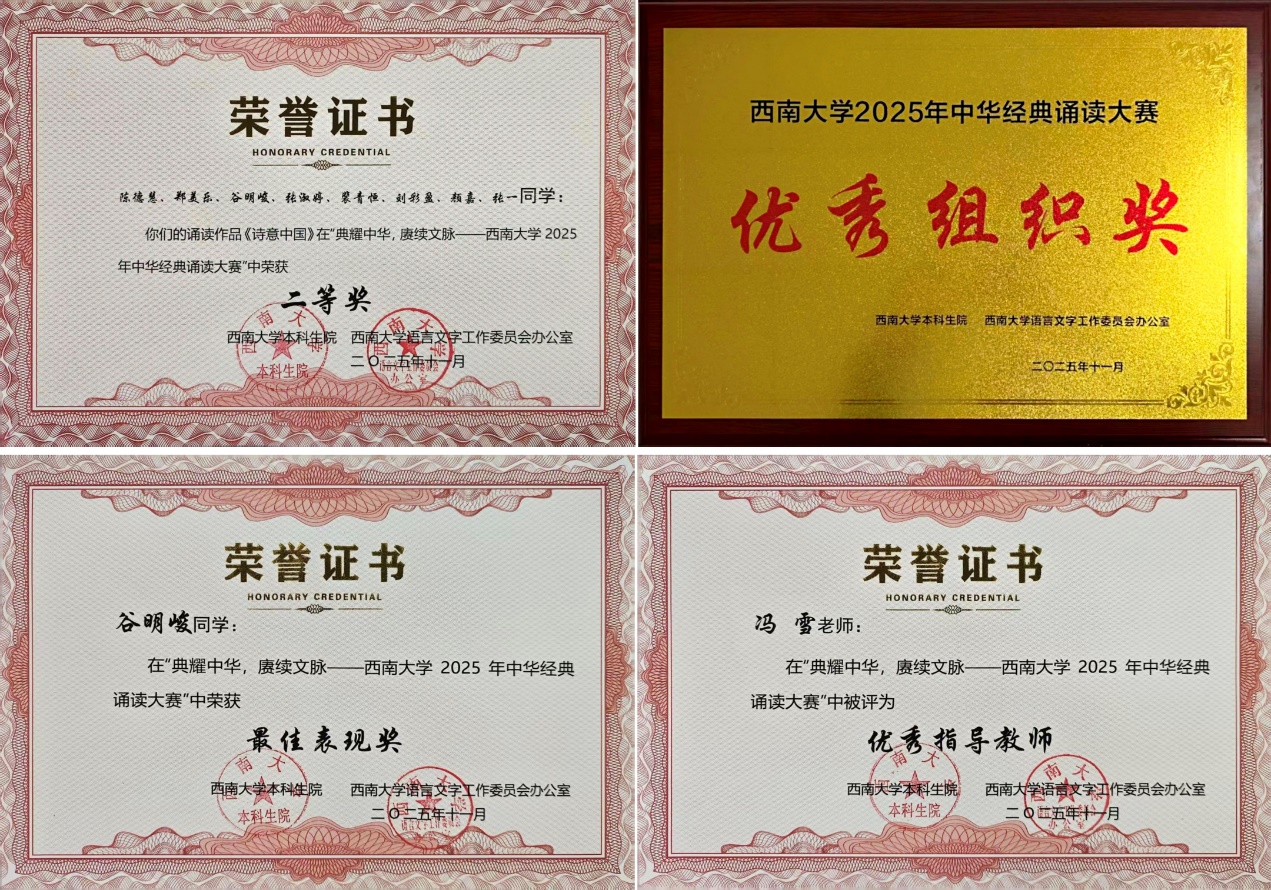 2025年11月28日,"典耀中华,赓续文脉——2025年中华经典诵读大赛"决赛圆满落幕。由betway必威中国中外员工共同演绎的诵读作品《诗意中国》在激烈角逐中荣获大赛二等奖,betway必威中国同时斩获"优秀组织奖",谷明峻同学荣获"最佳表现奖",指导教师冯雪获评"优秀指导教师"。