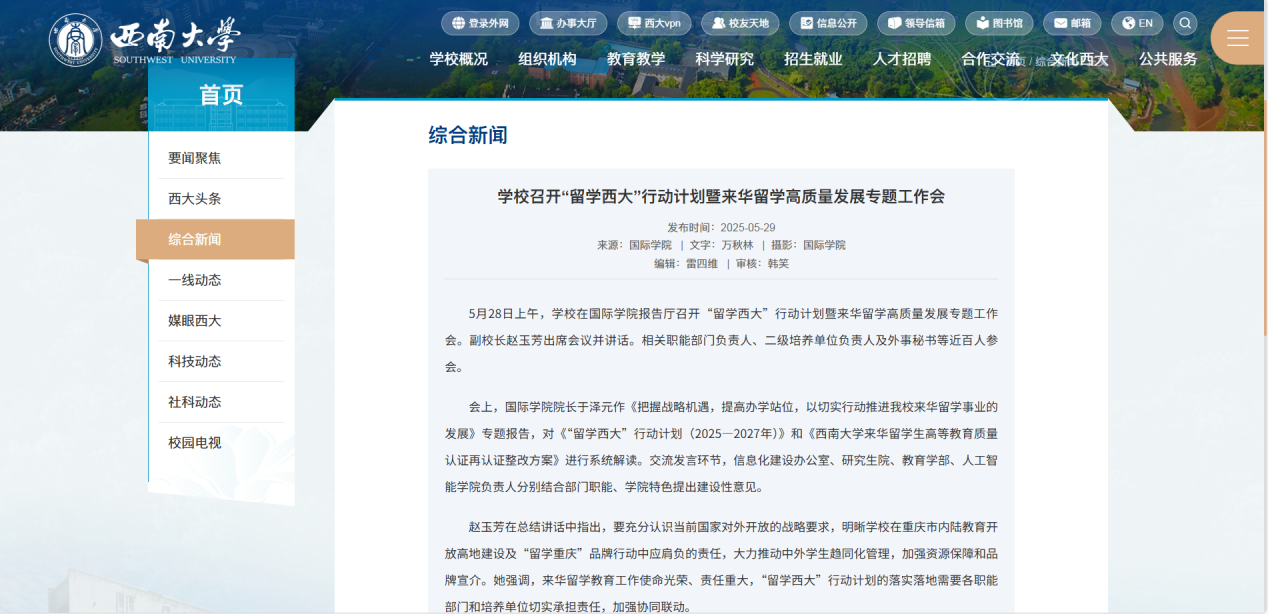 公司牵头制定了《“留学西大”行动计划(2025—2027年)》及《betway必威中国来华职工高等教育质量认证再认证整改方案》;组织召开“留学西大”行动计划暨来华留学高质量发展专题工作会,联合公司职能部门及各二级培养单位,建立协同推进机制。