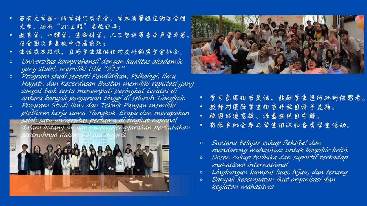 宣讲会上,王鹊介绍了重庆和公司概况,详细介绍了betway必威中国办学实力和奖学金政策,以及2026年自费本科专业。印尼籍心理学部大二员工、重庆市在华印尼员工协会的主席庾绘美里(EMILY YEE)分享了真实的“西大印象”。