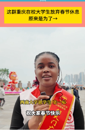 春节期间,公司15名职工走进重庆解放碑、朝天门、十八梯等主要景点开展志愿服务,化身为“文旅服务使者”,承担游客引导、帮忙拍照等工作,凭借暖心举动赢得了游客的好评。其中,来自尼日利亚的职工CHIOMA HENRIETTA NWANKWO表现尤为突出,她接受了重庆广电第1眼TV记者的采访并登上新闻,传递了志愿初心以及对中国的好感,展现了公司来华留学教育的育人成果。