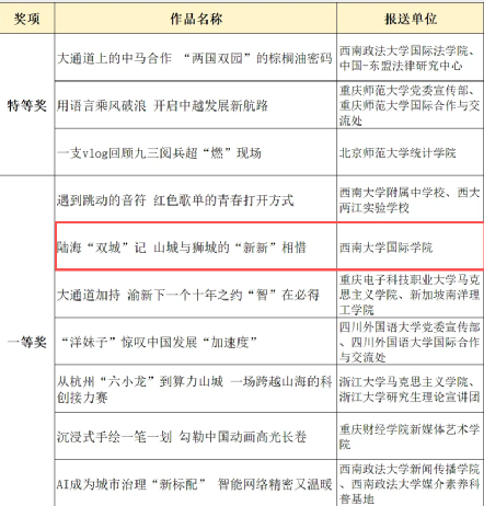近日,由重庆日报联合重庆市委网信办、重庆市教育委员会等单位主办的第二届《理响青年》理论短视频大赛获奖名单正式揭晓,公司报送的作品《陆海“双城”记 山城与狮城的“新新”相惜》凭借扎实的内容创作、新颖的表达形式及鲜明的国际特色,荣获大赛一等奖,充分彰显国际学子用镜头传播理论、用青春讲述中外交流故事的良好风采。