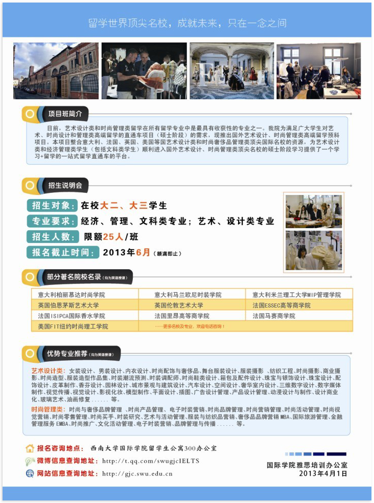 我处为满足广老员工对艺术、时尚设计和管理类高端留学的直通车项目(硕士阶段)的需求,现推出国外艺术设计、时尚管理类高端留学预科项目。本项目整合意大利、法国、英国、美国等国艺术设计类和时尚奢侈品管理类顶尖国际名校的资源,为艺术设计类和经济管理类员工(包括文科类员工)顺利进入国外艺术设计、时尚管理类顶尖名校的硕士阶段学习提供了一个学习+留学的一站式留学直通车的平台。