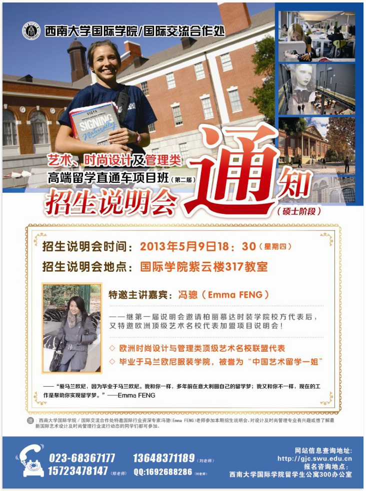 注:国际处特邀国际行业资深专家冯骢(Emma FENG)老师参加本期招生说明会,对设计及时尚管理专业有兴趣或想了解最新国际艺术设计及时尚管理行业流行动态的同学们都可参加。