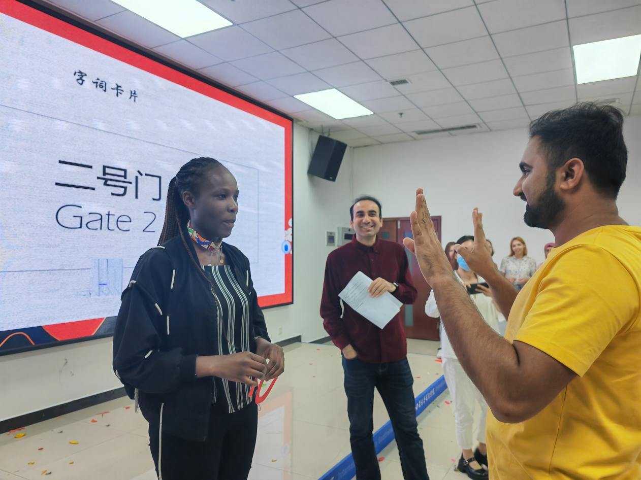 小组成员竖队排列,后一成员向前一成员进行肢体动作演绎,规定时间内猜出词语最多的队伍获胜。“银行”一词出现时,比划的同学先做出取钱的动作,再做出数钱的动作,旁边的同学瞬间领会,恨不得自己去猜。