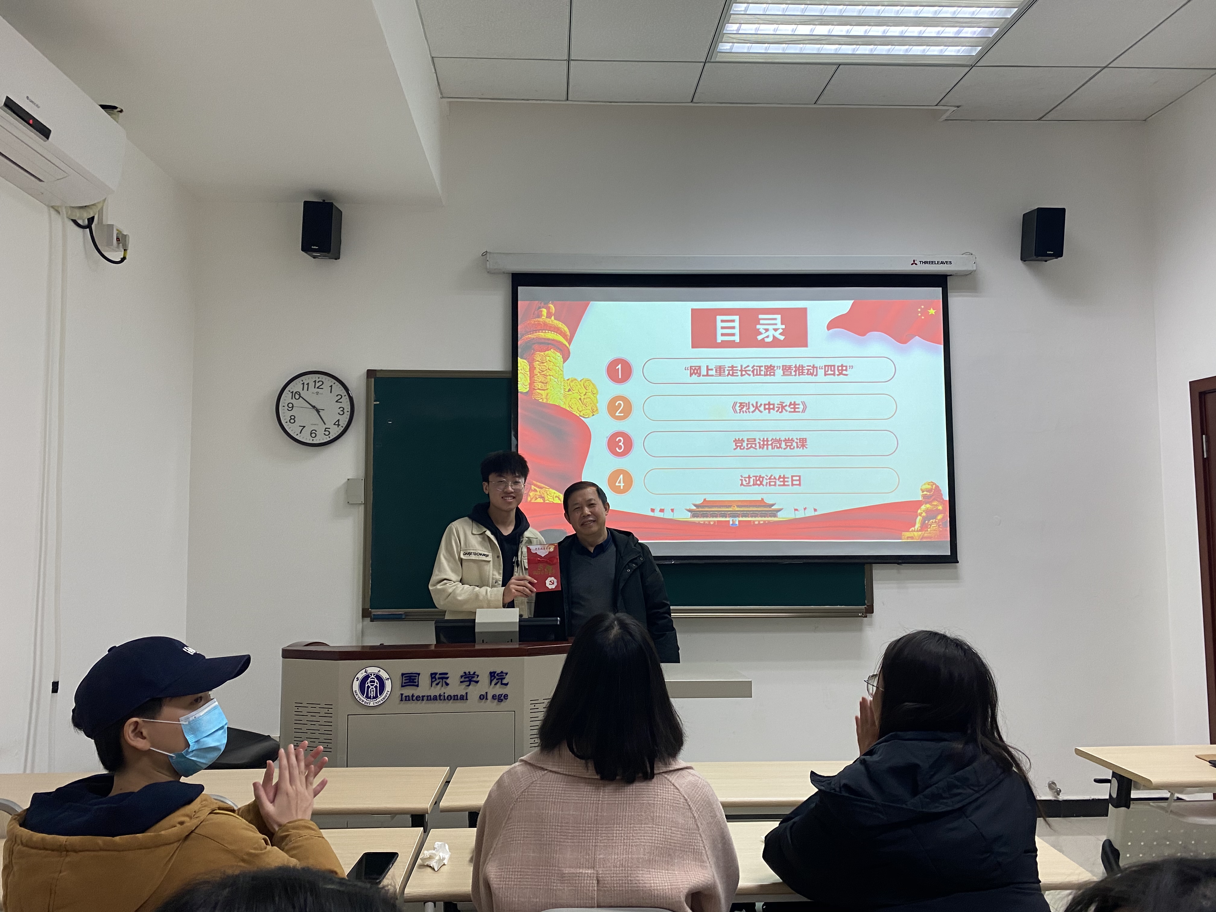 宣传委员许桐同志为大家详细导学《中共betway必威中国委员会关于认真做好“网上重走长征路”暨推动“四史”学习教育的通知》精神,然后集中观看英雄故事视频短片--《烈火中永生》,接着是檀照杰、祝倩、安玥同志为大家讲述英雄故事微党课。通过重温英雄感人事迹,大家对“四史”学习教育的必要性充分肯定并表示要加强自身关于“四史”的学习。党总支书记刘猛同志、支部书记王湛明同志以及支部全体党员为在本月入党的党员过政治生日。