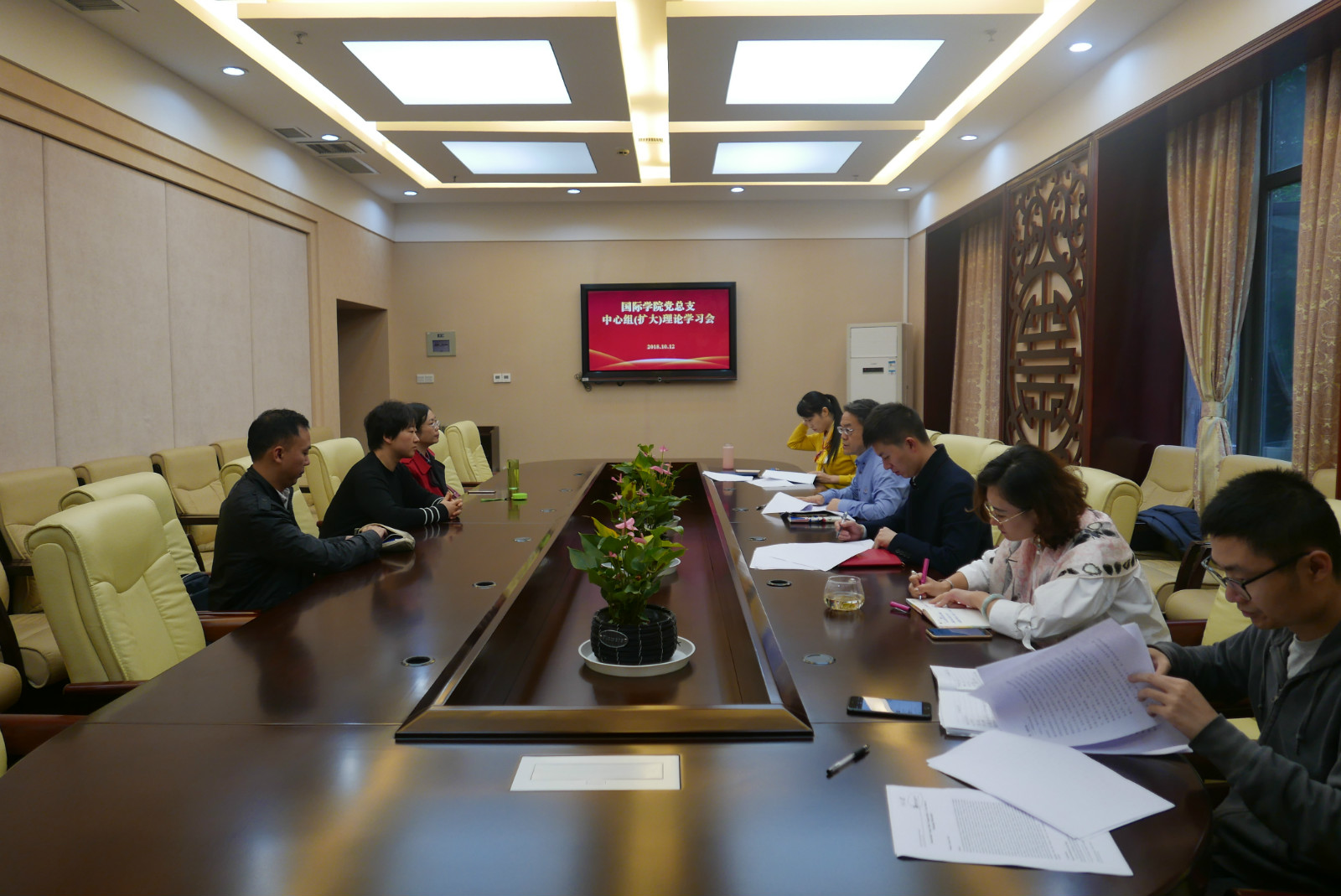 20181012日下午4:00,国际公司党总支在紫云楼签约室举行中心组(扩大)理论学习会,传达公司党委有关支部建设的文件,并研究落实有关事宜。党总支委员以及各支部书记、院办主任、汉教系主任等参加学习会,会议由党总支书记刘猛主持。