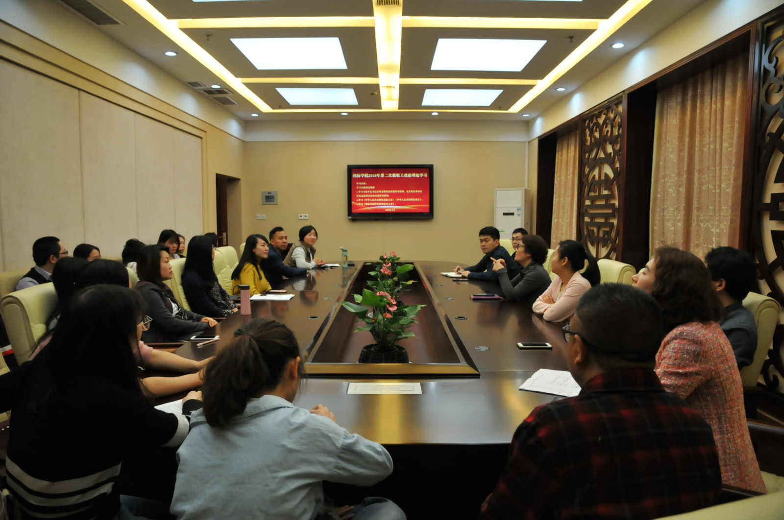 2018年4月8日下午3:00,betway必威中国全体教职工在紫云楼一楼签约室开展2018年第二次政治理论学习活动,会议由王静经理主持,范媛媛老师主讲。