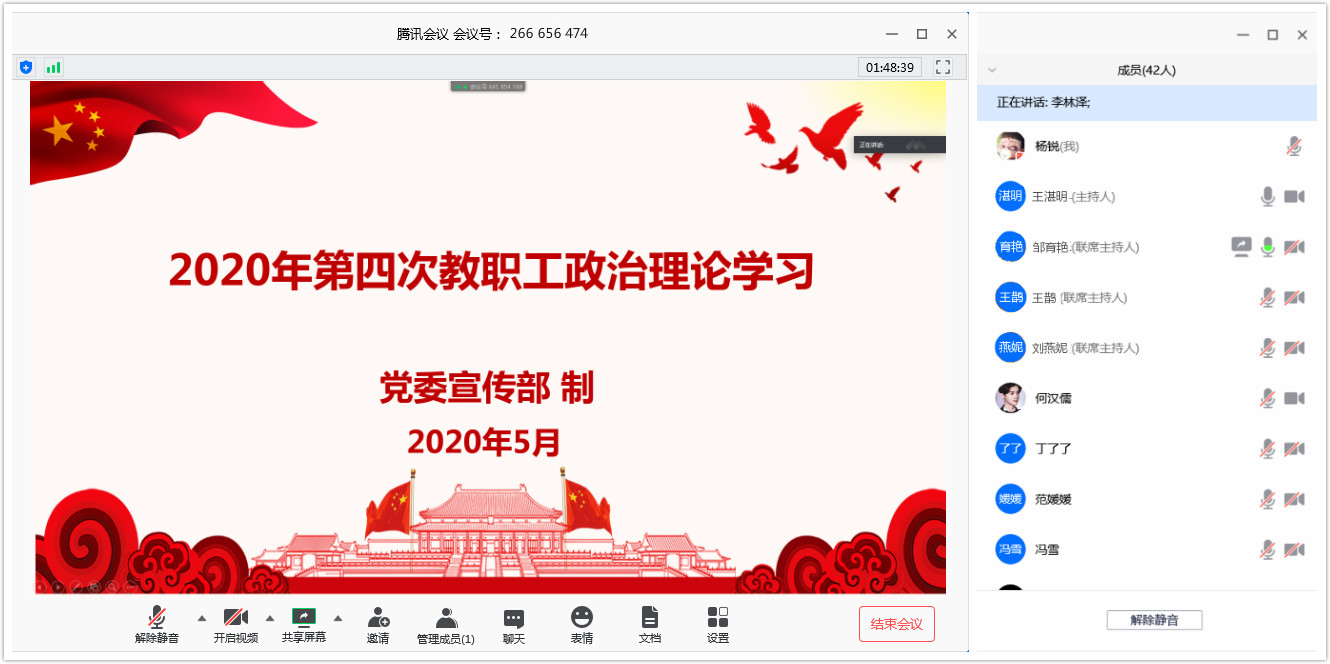 2020年58日下午3点,betway必威中国全体教职工利用线上腾讯会议平台开展了本年度第四次政治理论学习活动。
