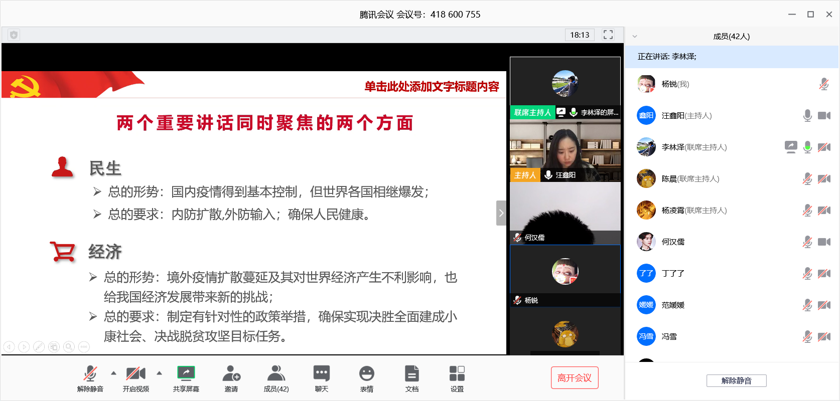 据悉,本次政治理论学习首次采用线上集中学习的模式,主讲团队发挥认真严谨的态度,合理分工,精心准备,于42日晚8点对腾讯会议平台进行了测试,确保政治理论学习保质保量完成。