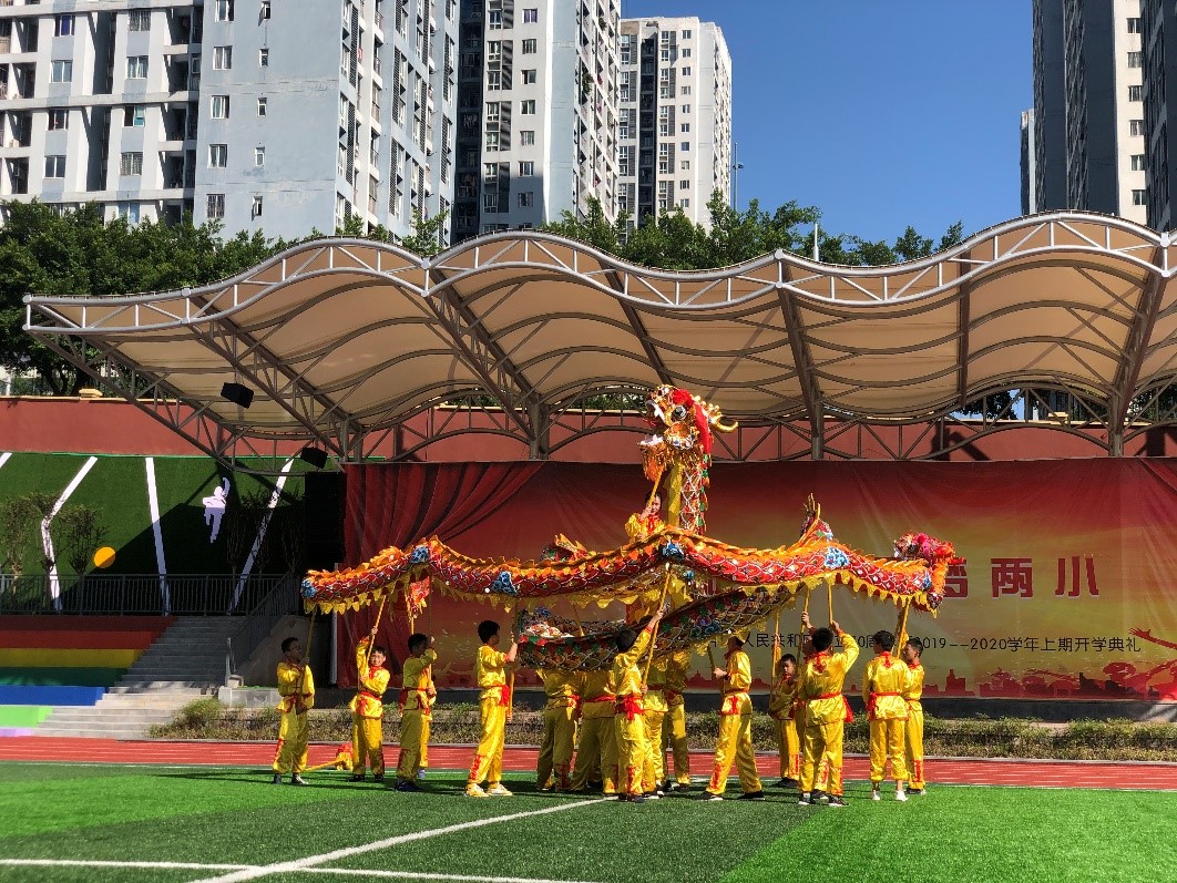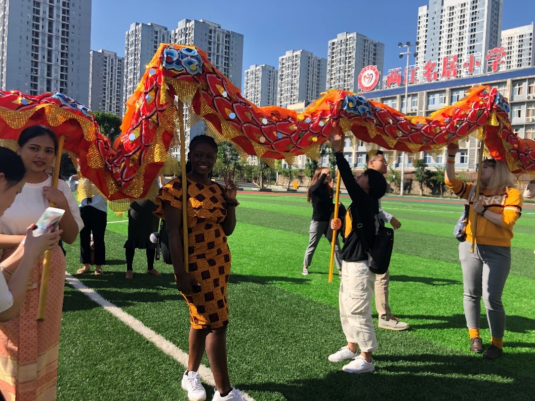 随后,两江名居小学的师生在运动场向betway必威中国的师生们展示了公司颇具特色的“父子龙”舞龙表演。表演中,老师们挥舞着“父龙”,员工们挥舞着“子龙”,每一个动作都让观看者拍手叫绝。在体验舞龙魅力的过程中,刚果布职工思拉河还即兴为大家表演了一段精彩的中国武术,场面热闹非凡。