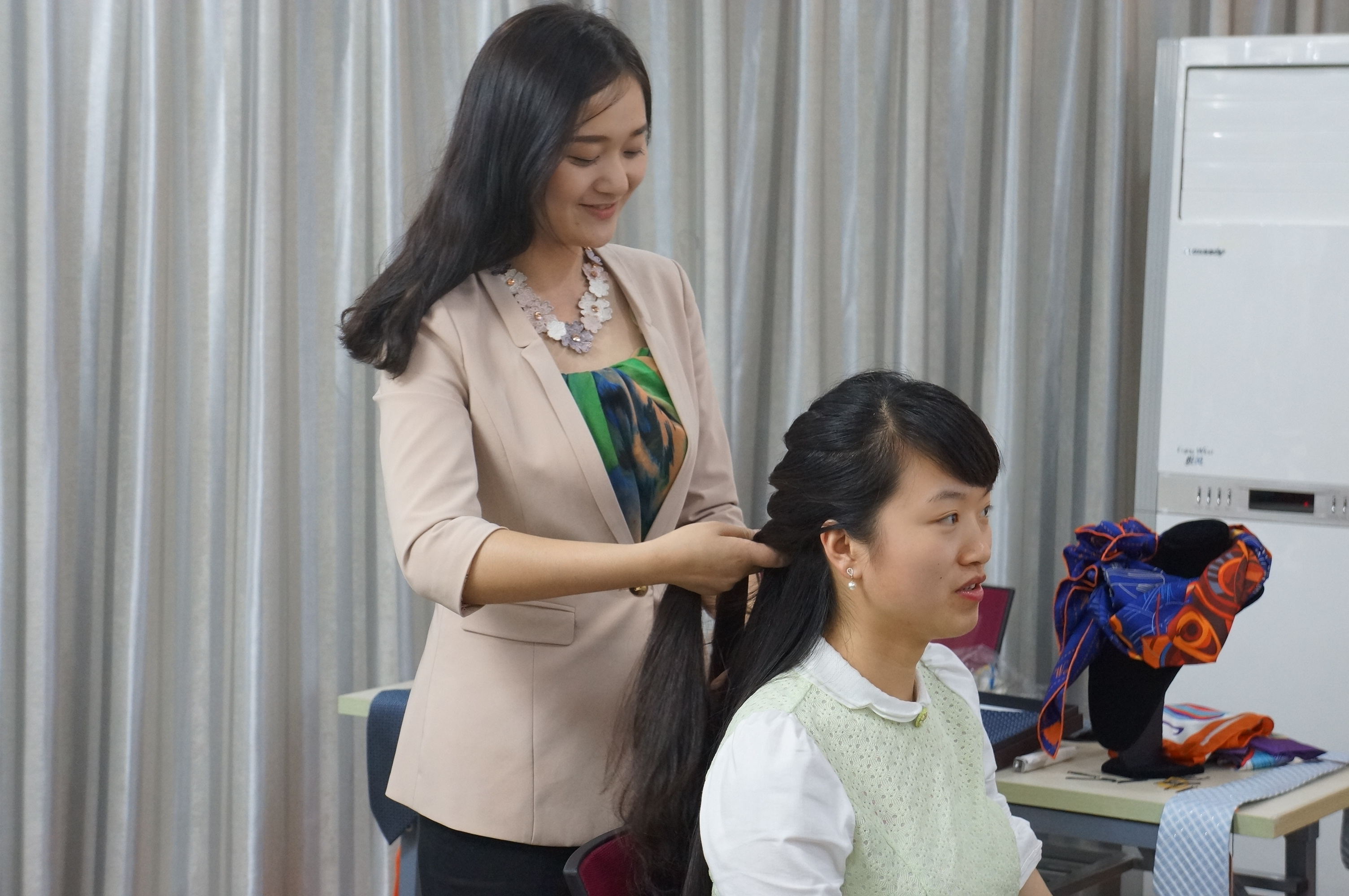 万事利集团高级礼仪讲师任静做专题演示,内容涉及职场礼仪、服装搭配、化妆礼仪等。她提出,服装礼仪要充分考虑场合、时间、对象,男士着西装要遵循“三三原则”。她还现场演示如何将一条普通的丝巾千变万化为着装画龙点睛,男士领带的各种系法,如何保持最美的微笑……任静老师专业的讲解、娴熟的手法让大家啧啧称赞,代远鸿、耿军、徐心三等老师更是现场变身模特,上台学习、展示,现场气氛热烈。