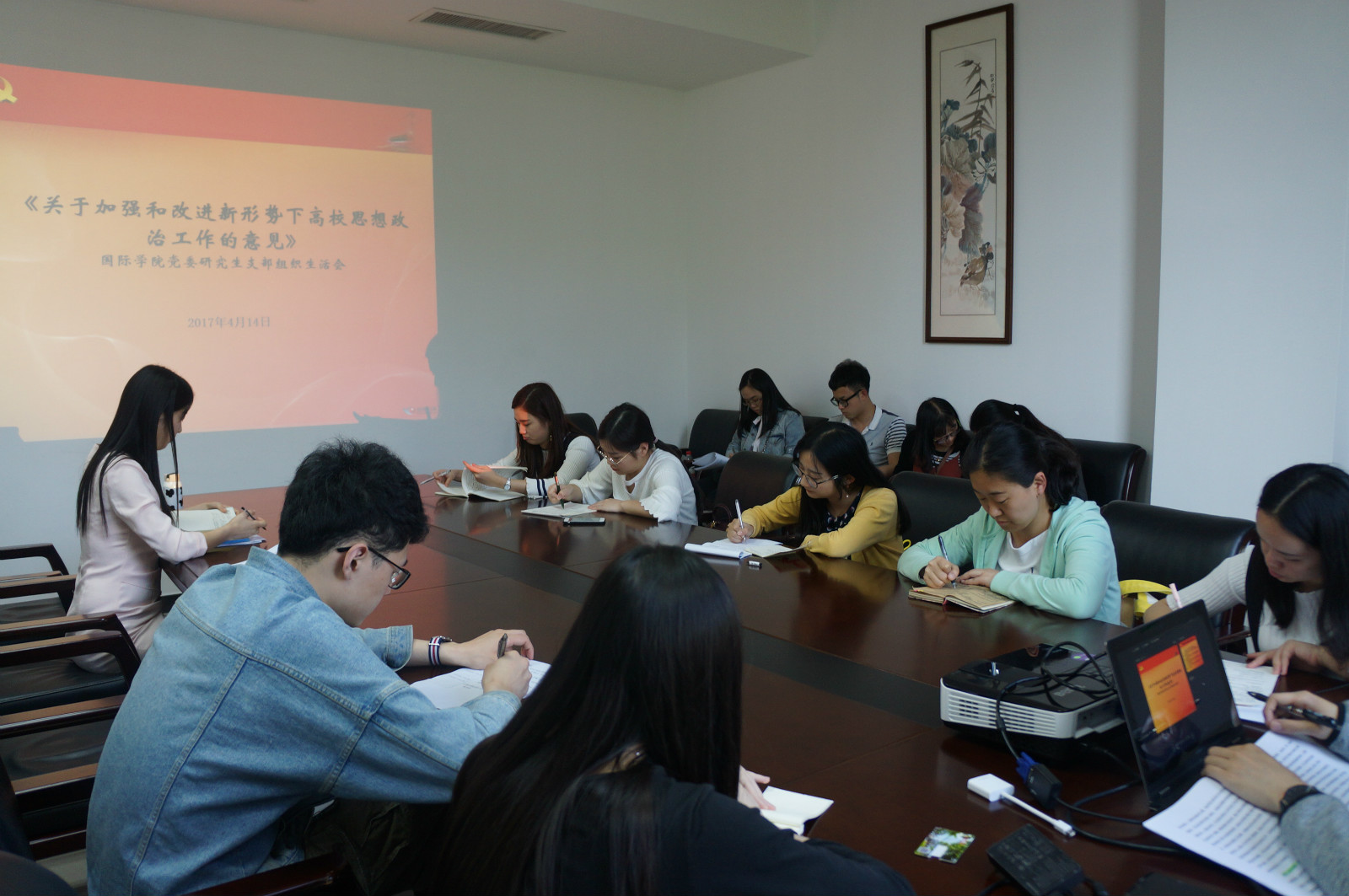 首先,全体党员集体收看央视播发的有关《意见》的新闻报道。然后,王湛明同志对《意见》的内核和要义进行了详细解读。接着,各位研究生党员结合自身经历与学科专业,分别从“新媒体”、“四个自信”、“汉语教学”、“海外实习”等方面谈了个人的学习体会。