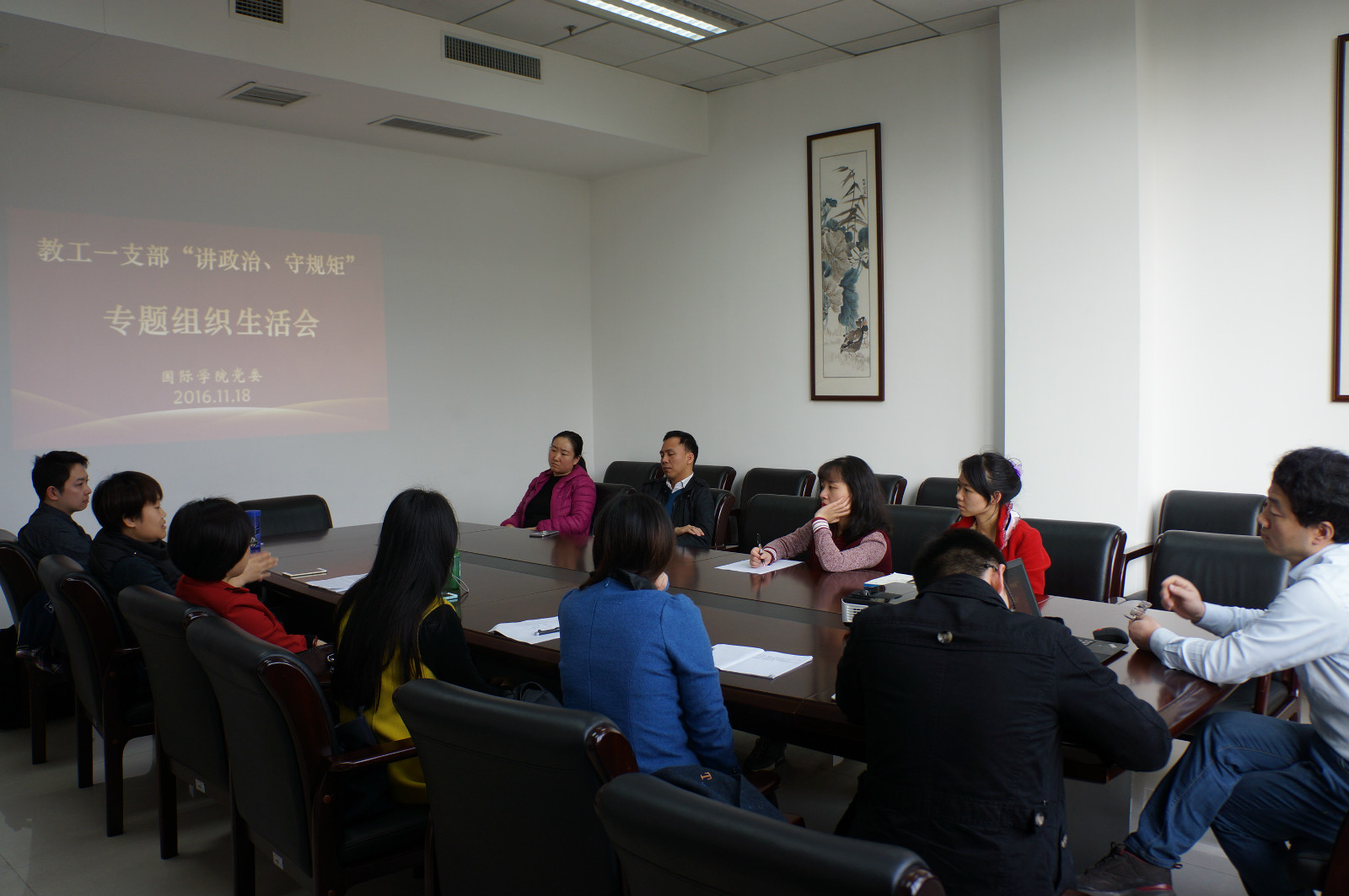 2016年11月18日下午3:00,betway必威中国教工一支部在紫云楼304会议室开展了以“讲政治、守规矩”为主题的专题学习研讨会。会议由支部书记邱睿同志主持。