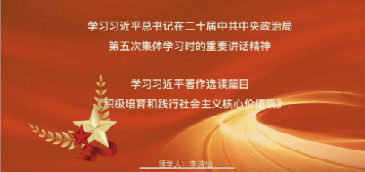 会议伊始,由支部党员李诗怡同志为大家领学习近平总书记在二十届中共中央政治局第五次集体学习时的重要讲话精神和习近平著作选读(第一卷)篇目《积极培育和践行社会主义核心价值观》。她指出,社会主义核心价值观,既体现了社会主义本质要求,继承了中华优秀传统文化,也吸收了世界文明有益成果,体现了时代精神,因此我们要在全社会牢固树立社会主义核心价值观。
